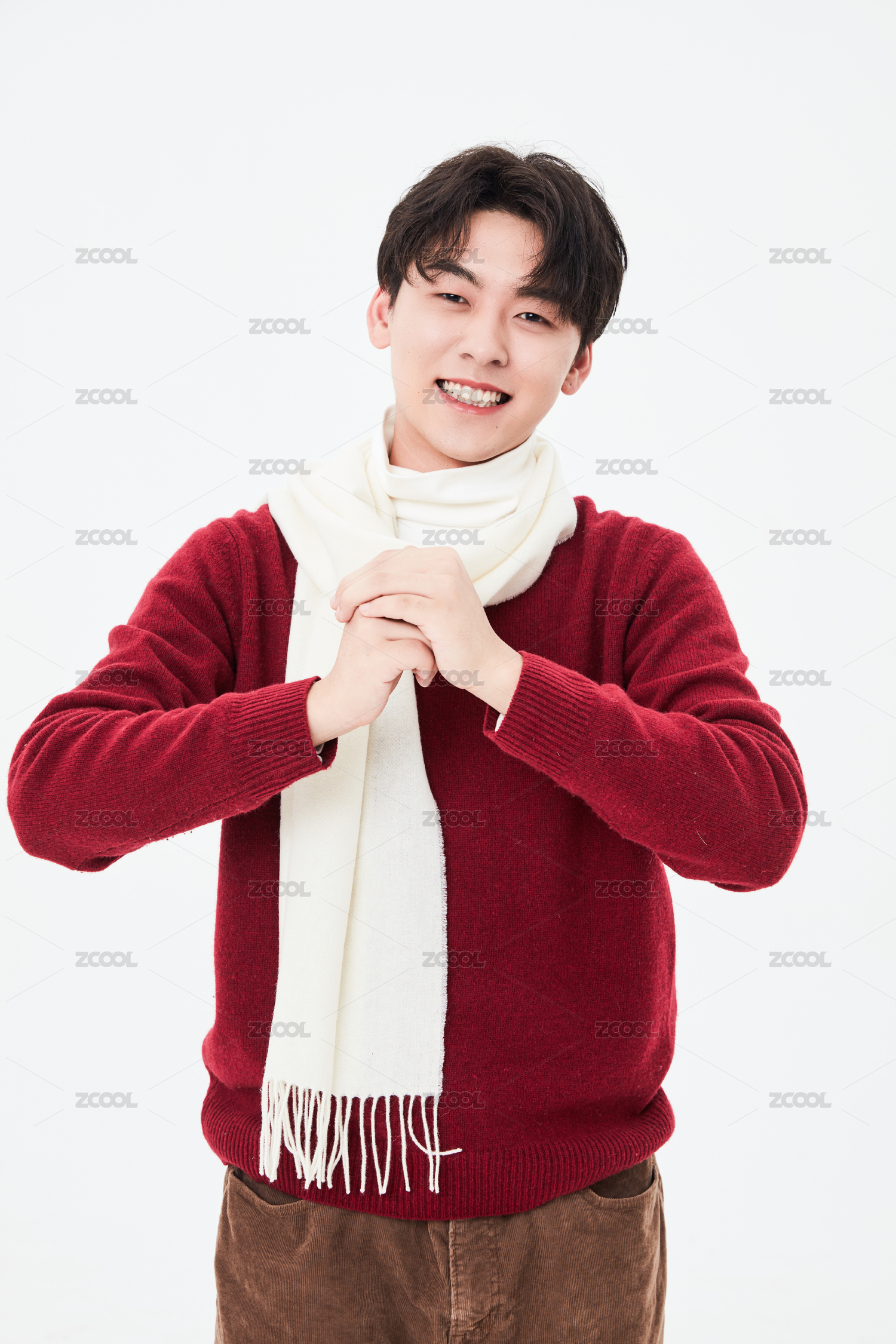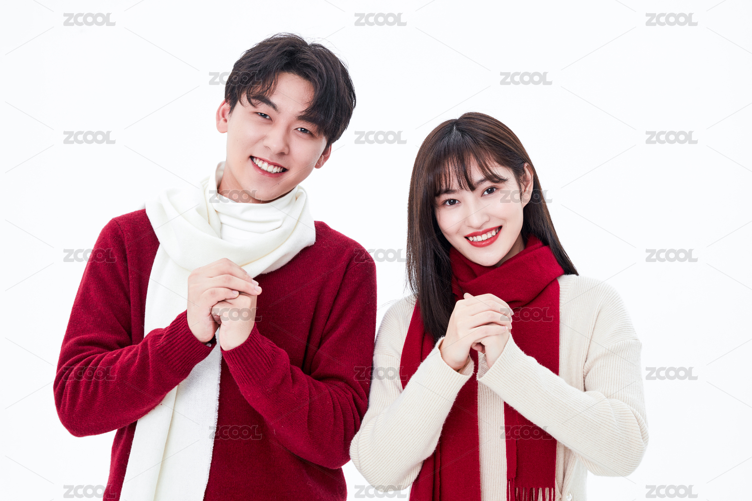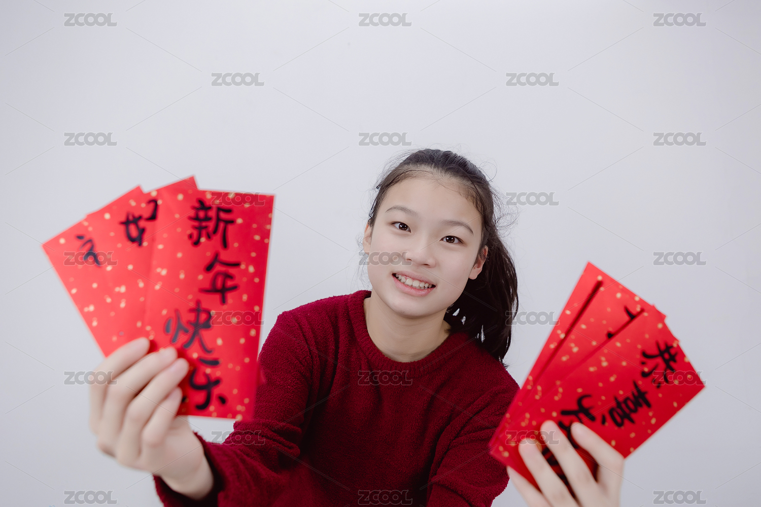 黑色长发的女生开心的微笑着做手势拜年贺喜