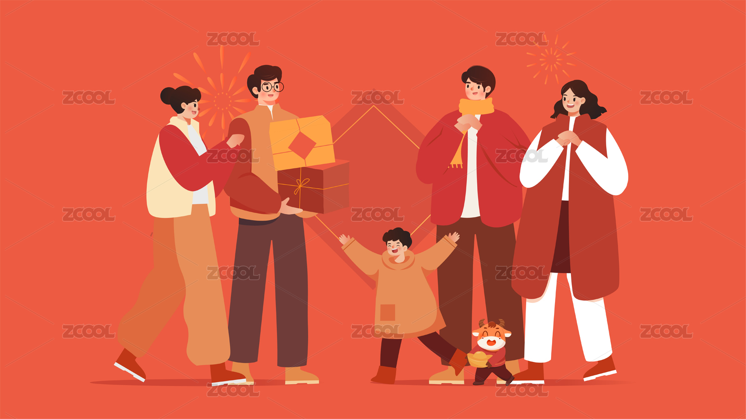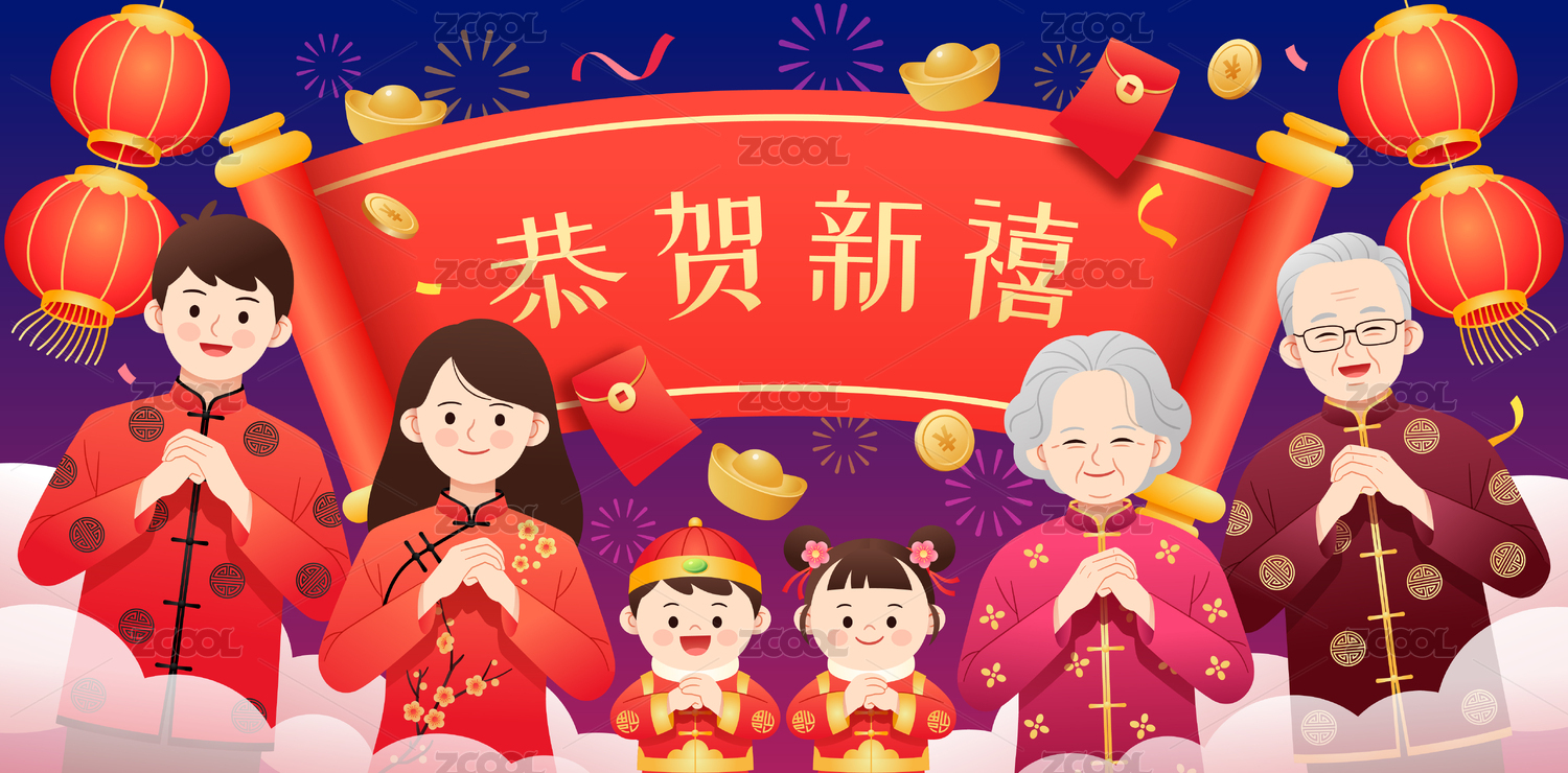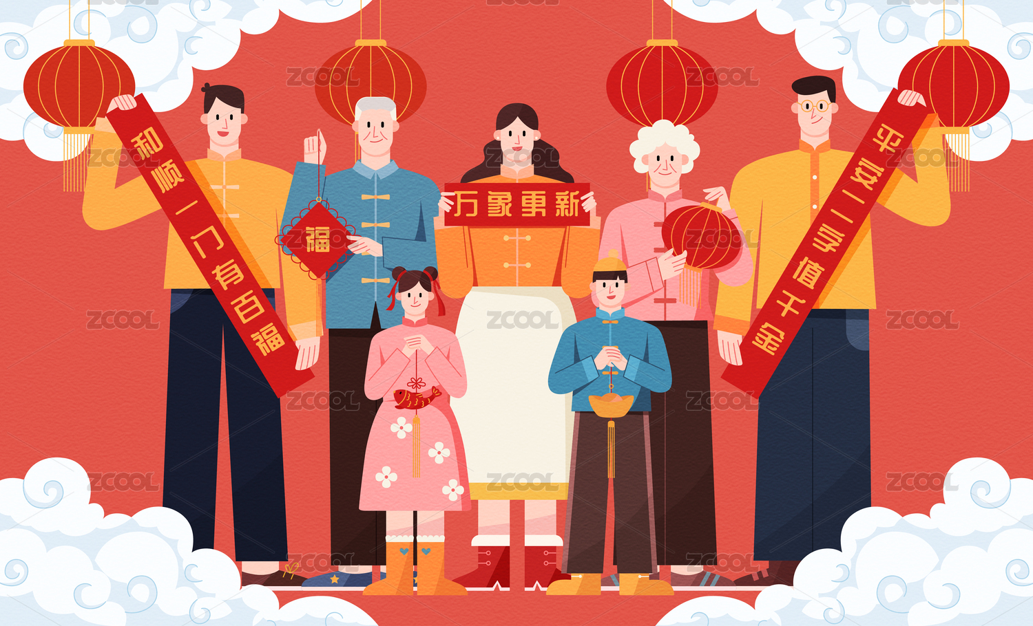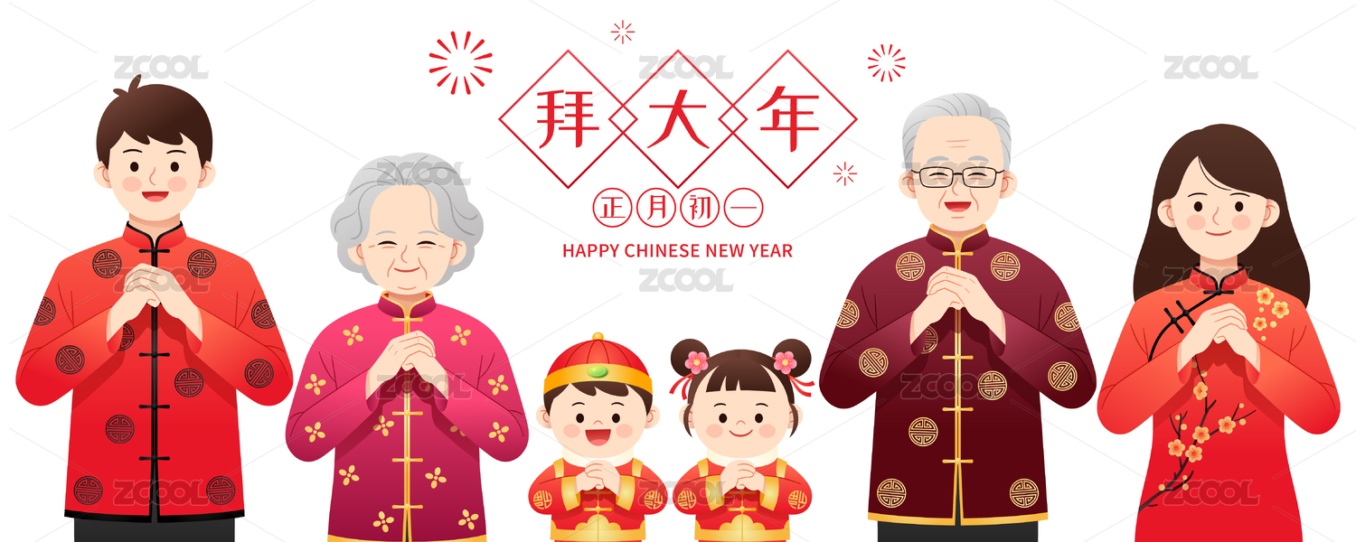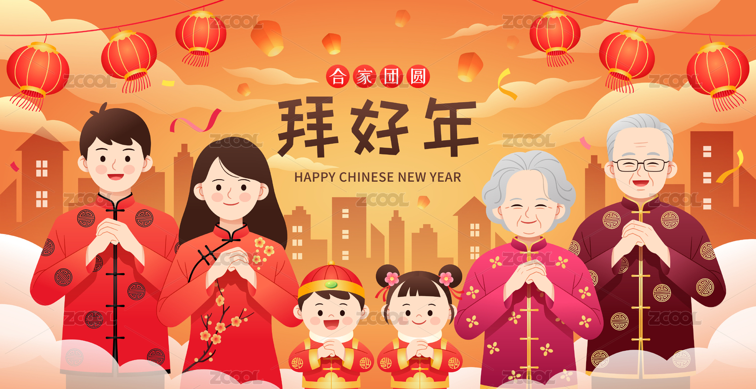 卡通2020鼠年新年春节家人拜年中国风背景矢量插画