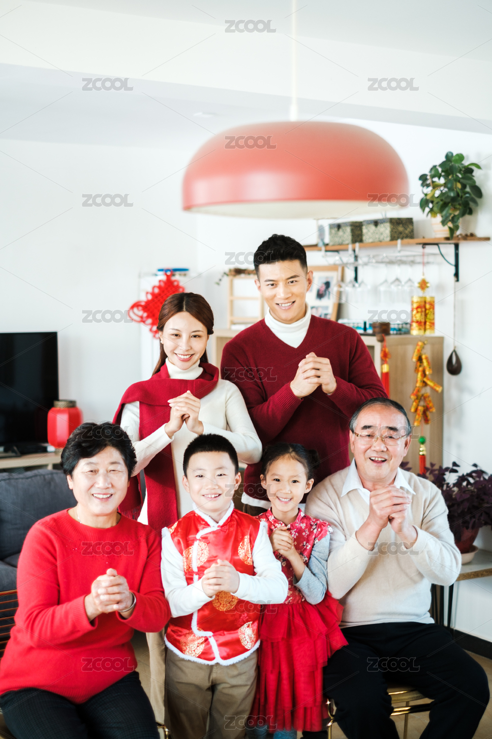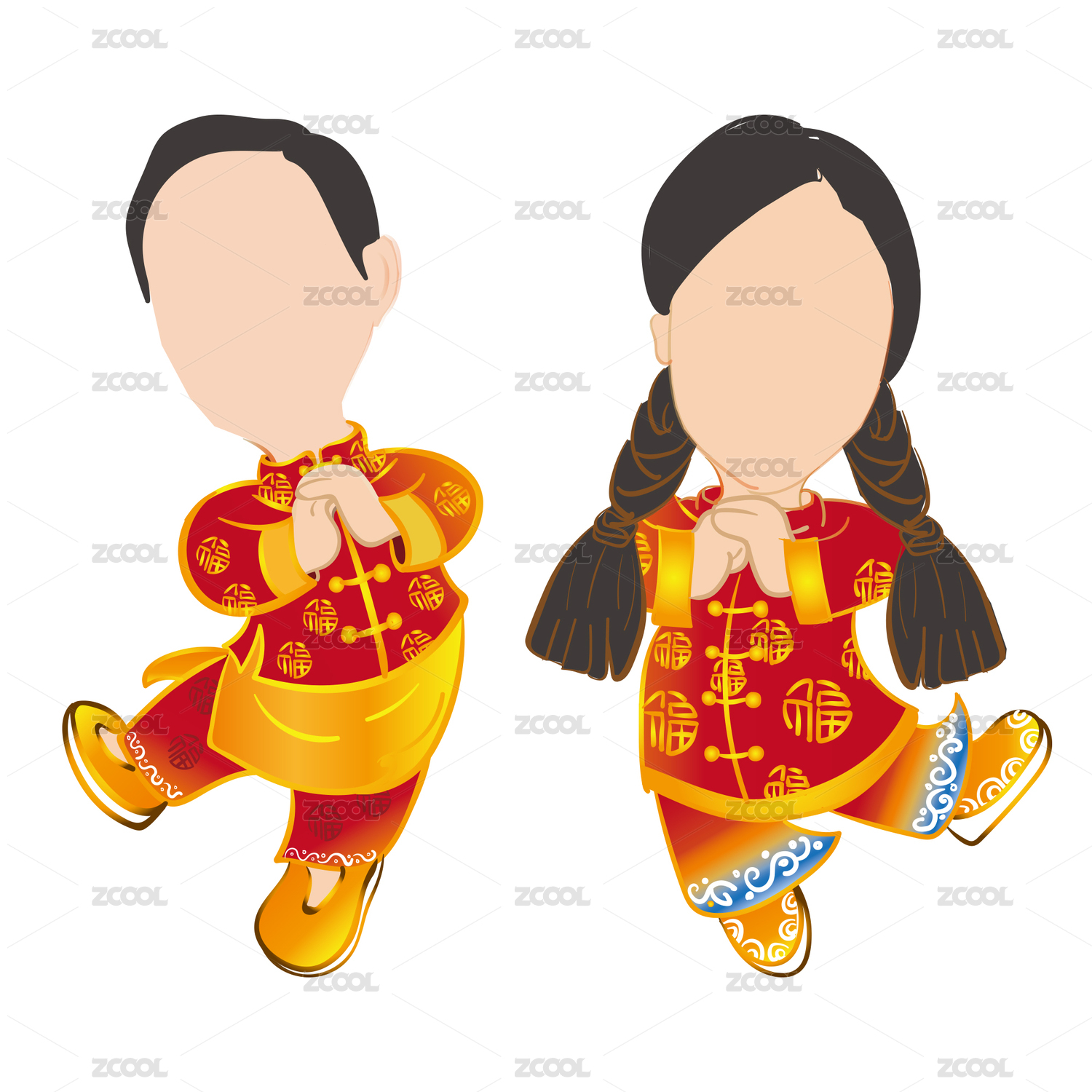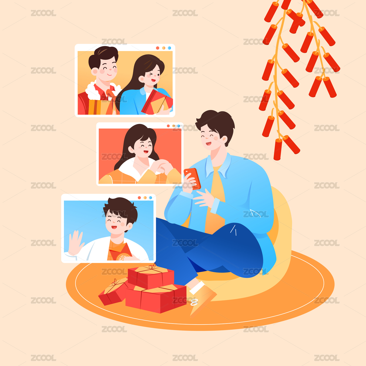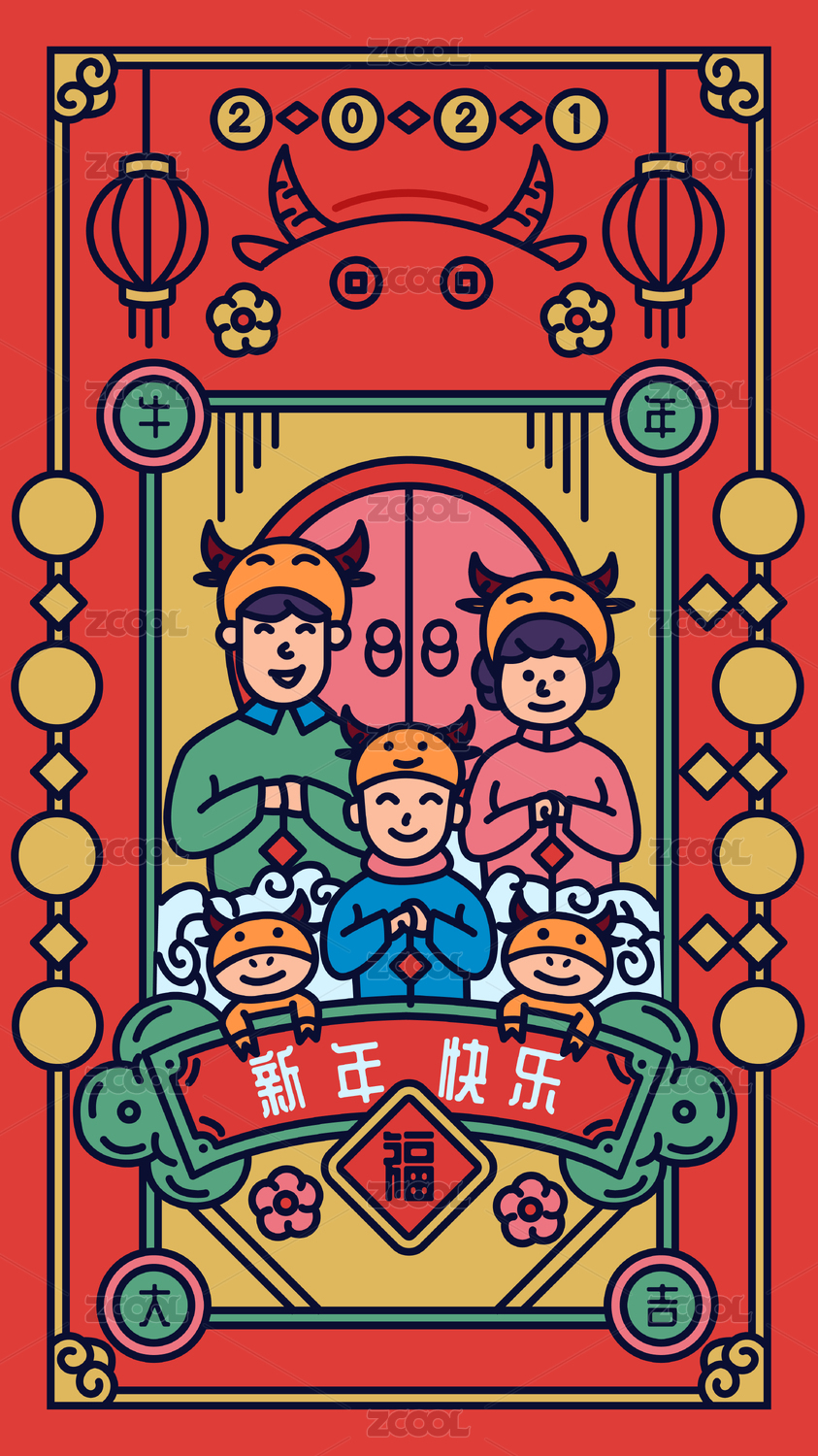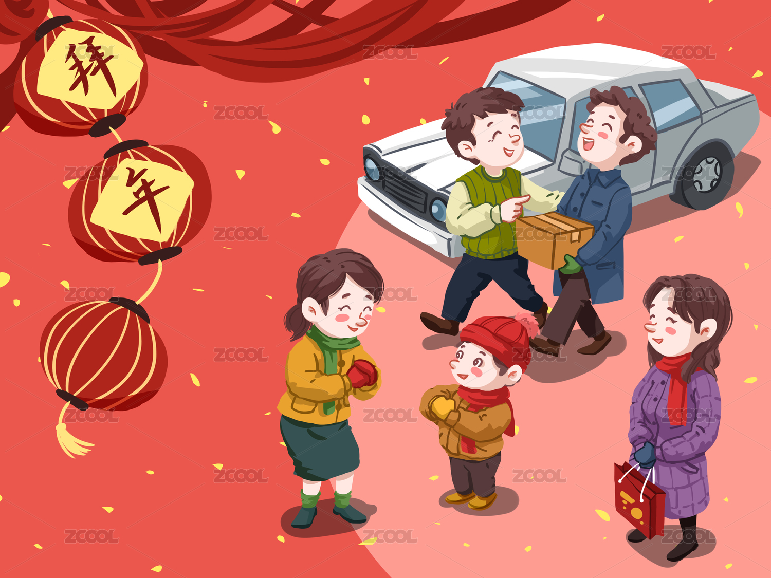 卡通2020鼠年新年春节家人拜年中国风背景矢量插画