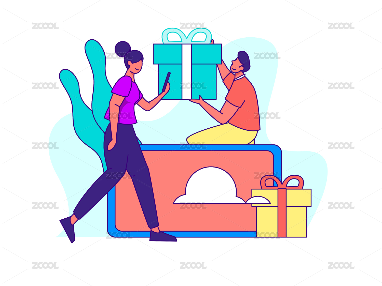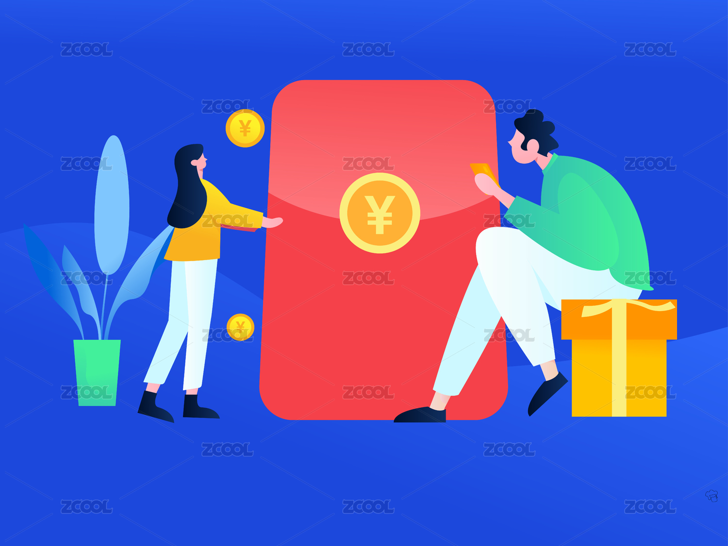 邀请好友的男女领取红包,扁平矢量人物场景创意概念插画