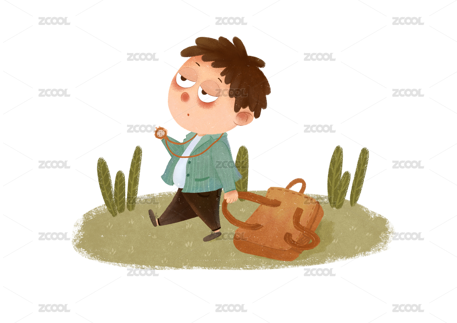 把书包拖在地上正在看表的小孩