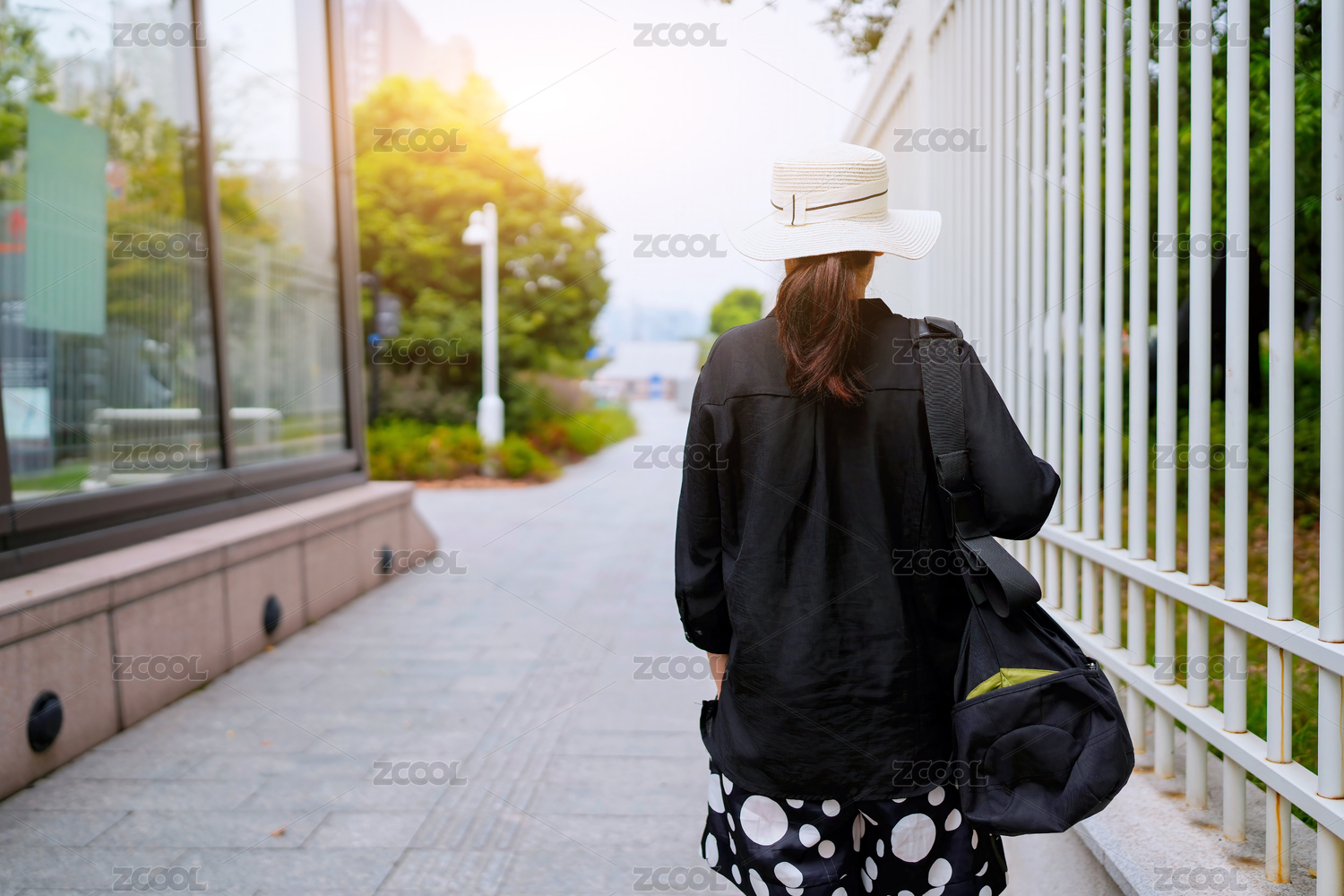 阳光明媚的日子里,戴帽子的女人走在城市小