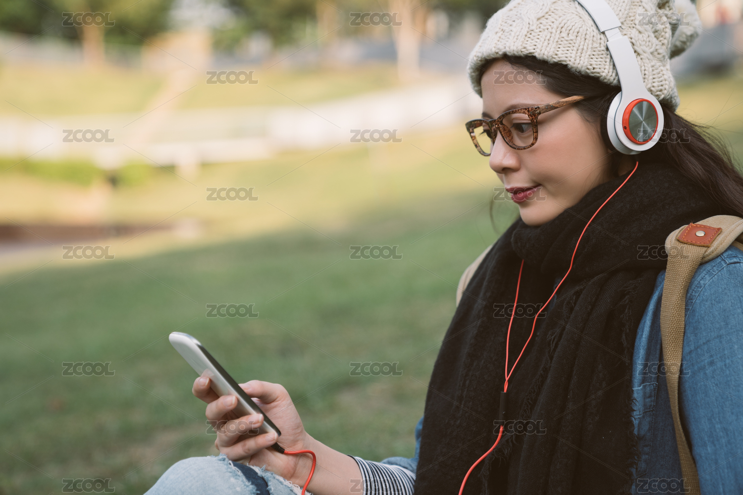 时尚迷人的亚洲女人喜欢智能手机的音乐在城市桥梁,女孩享受阳光灿烂的日子在冬季。
