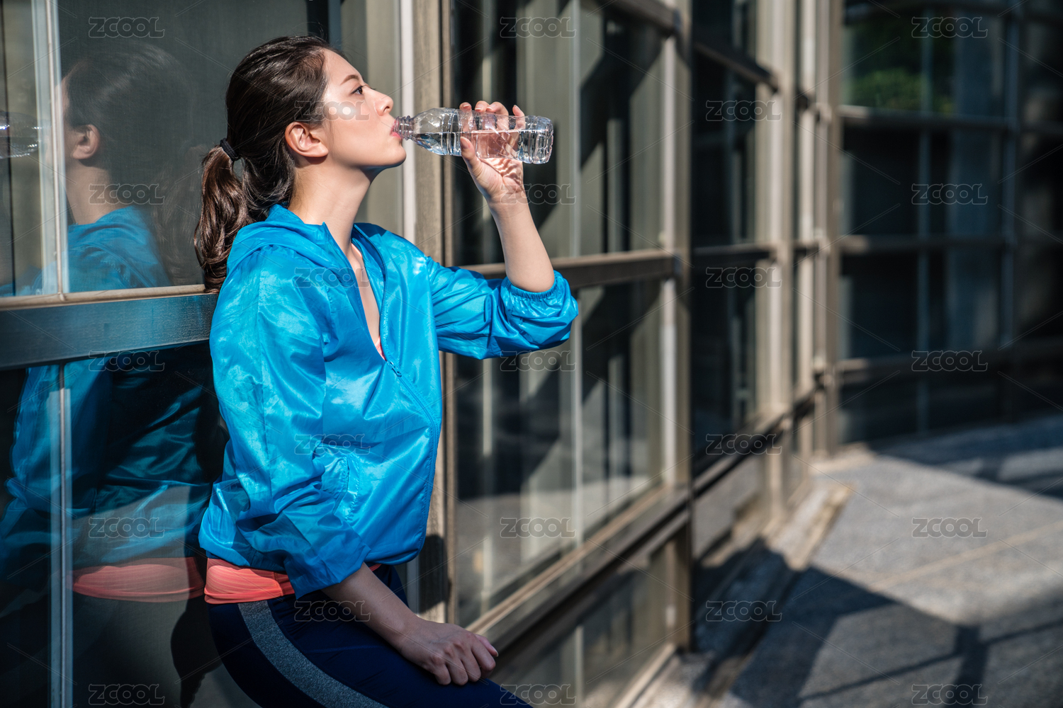 年轻女子是现代建筑大楼附近跑步训练,在休息一个阳光灿烂的日子后饮水。