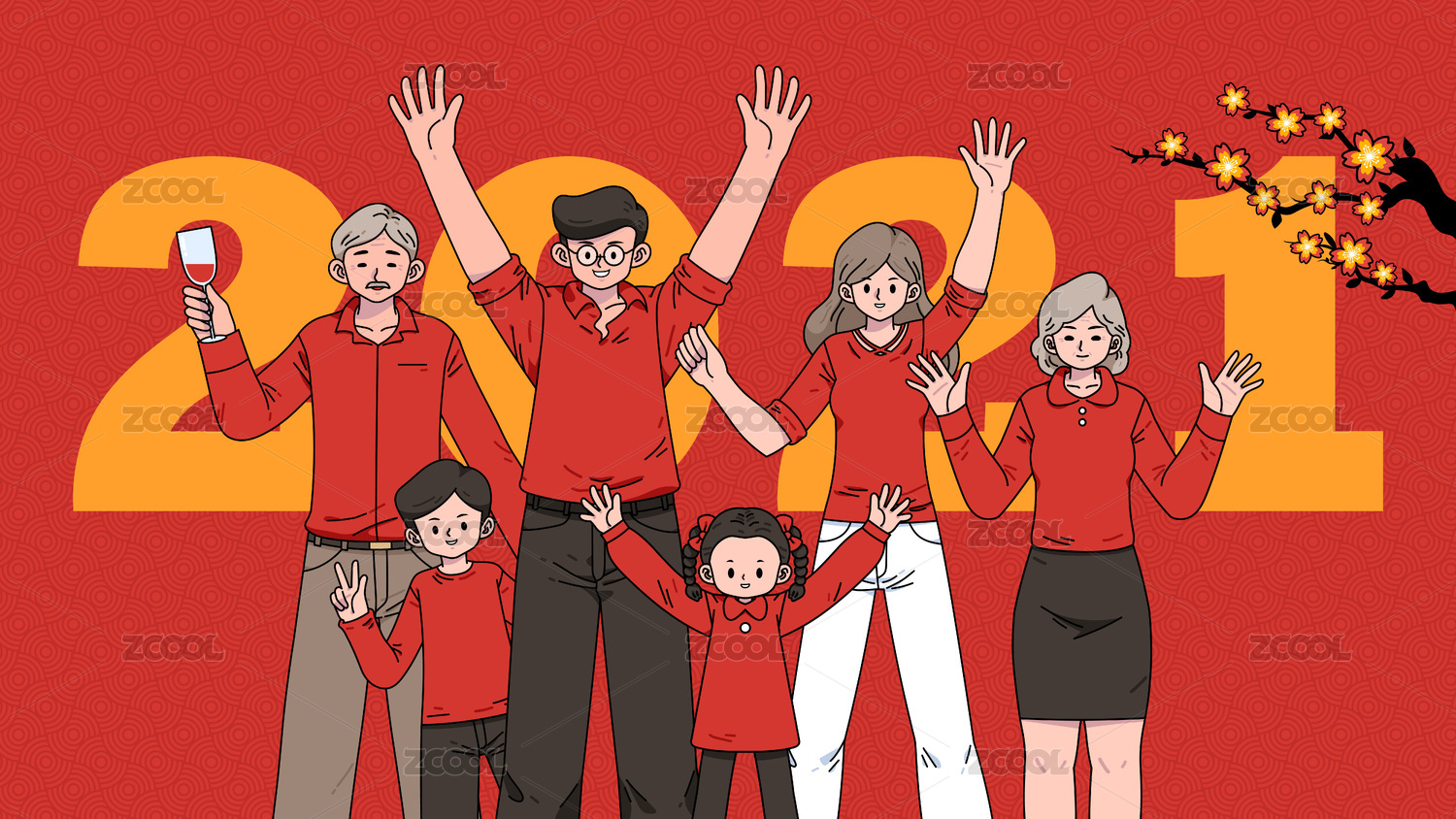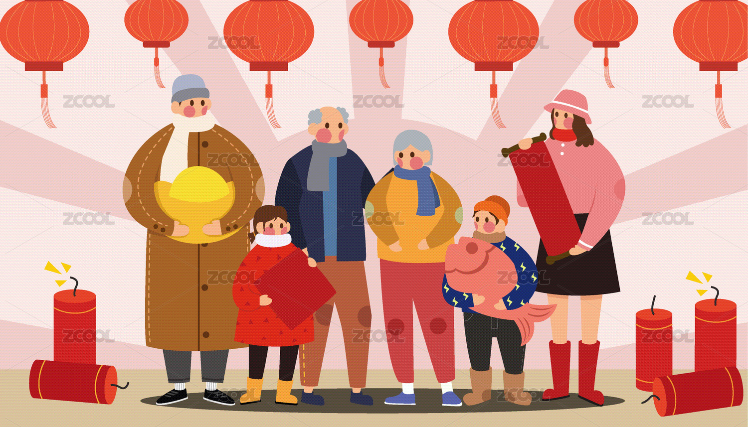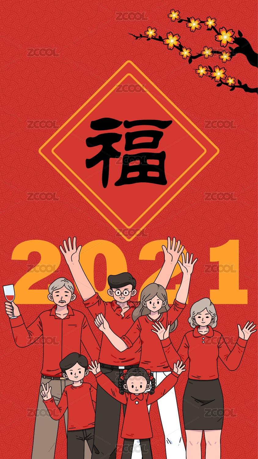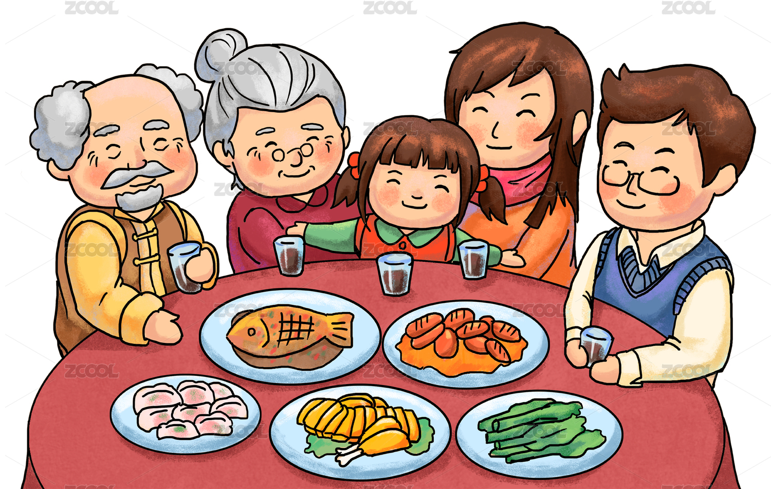 春节插画一家五口团团圆圆