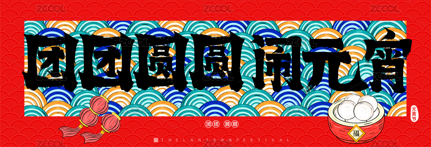 国潮云纹团团圆圆闹元宵灯笼汤圆送福书法字