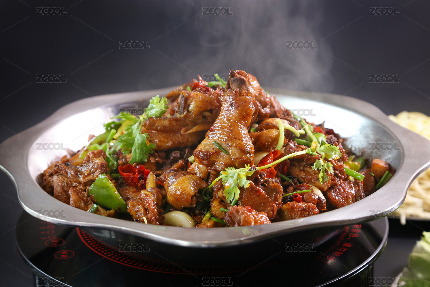 灰色背景上黑色砂锅里的松滋鸡