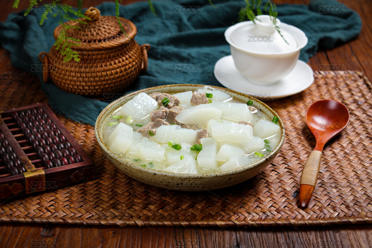 一碗萝卜炖羊肉汤摆放在餐桌上