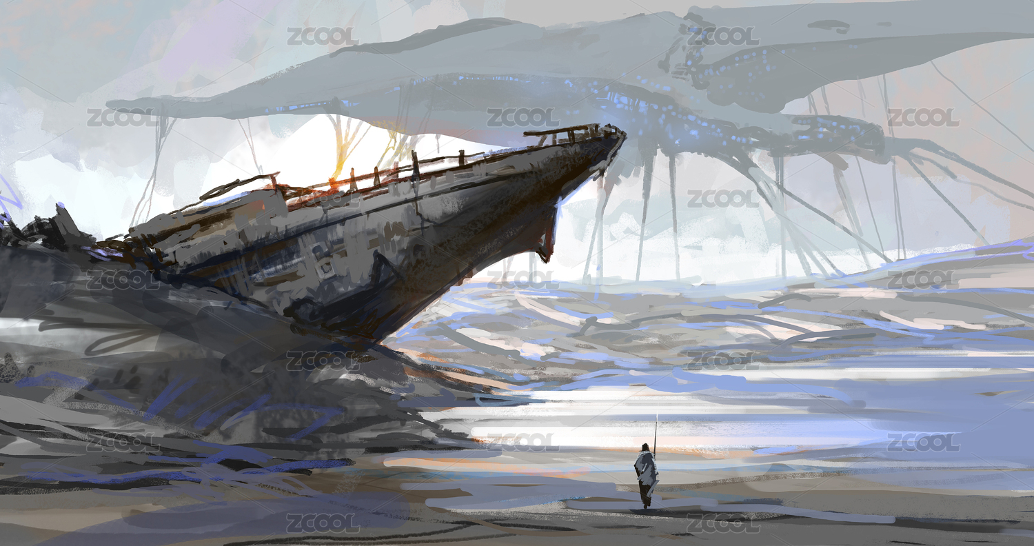 战争背景下搁浅的船,海滩概念设计数码绘画