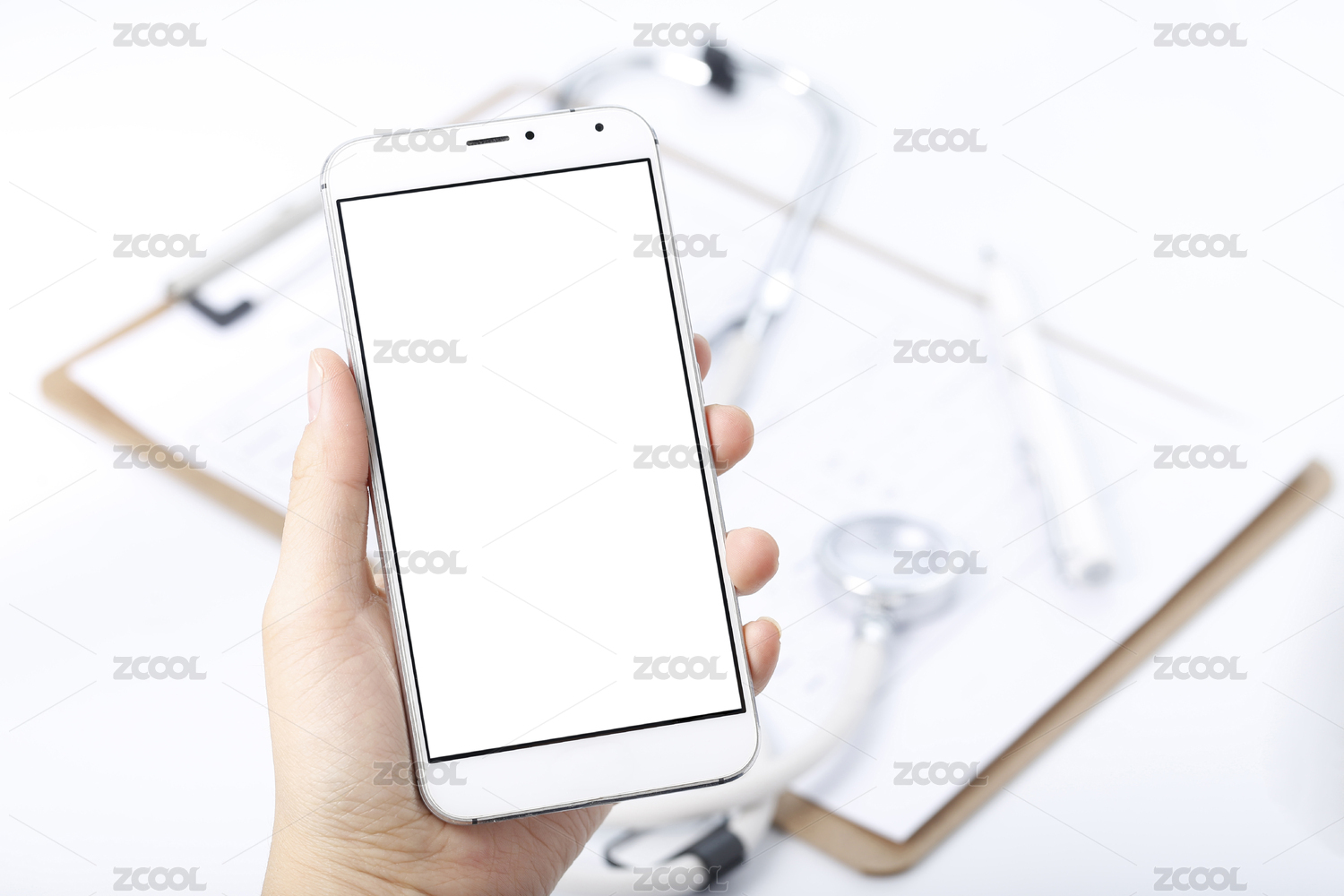 女性手拿手机,背景是医生的听诊器和病历夹(在线医疗,掌上医生,互联网医疗概念)