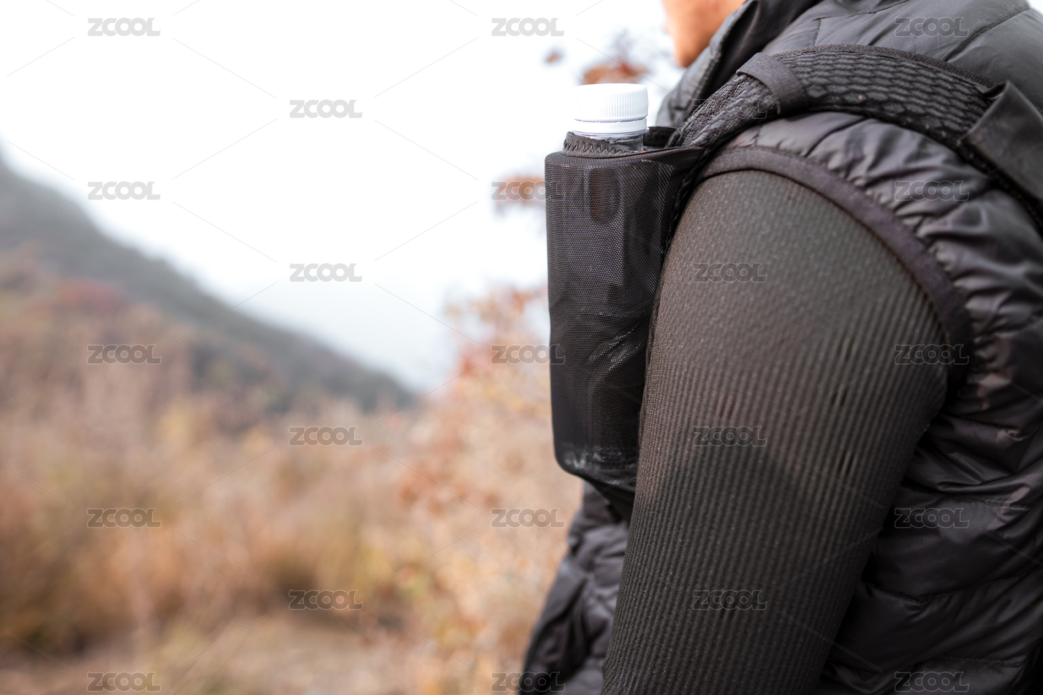 户外爱好者包上的水特写