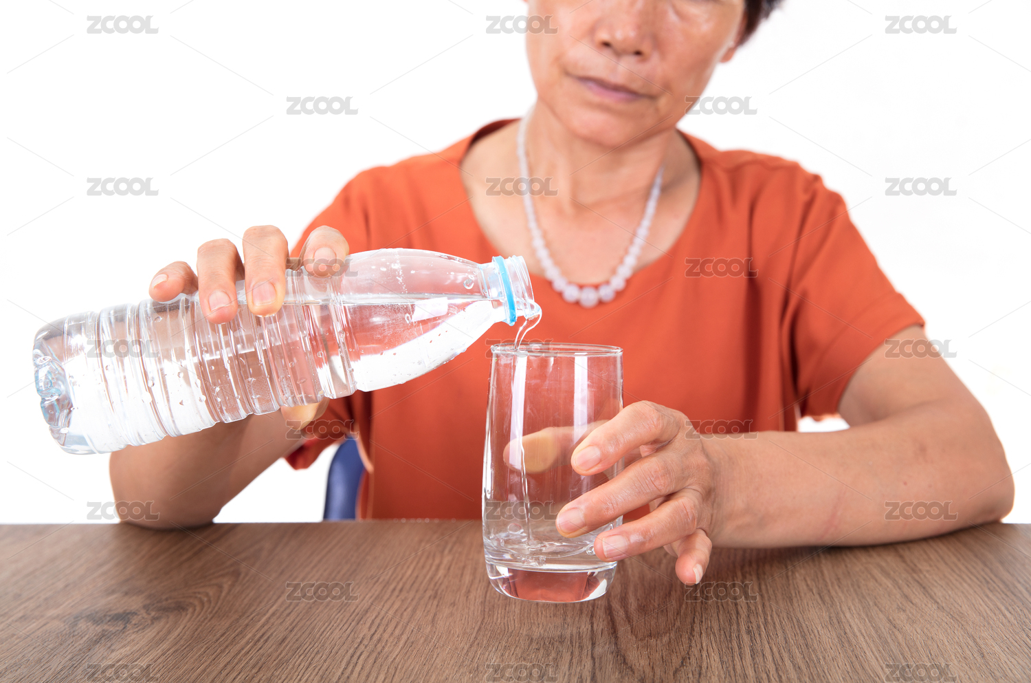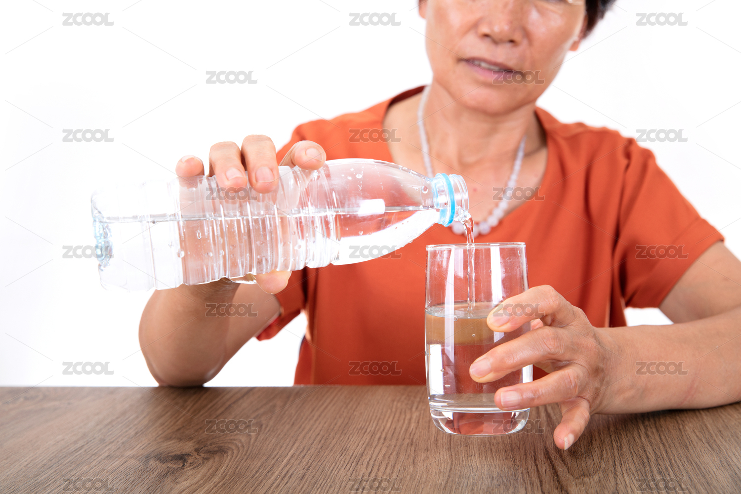 中国妇女正把瓶装矿泉水倒进玻璃杯里