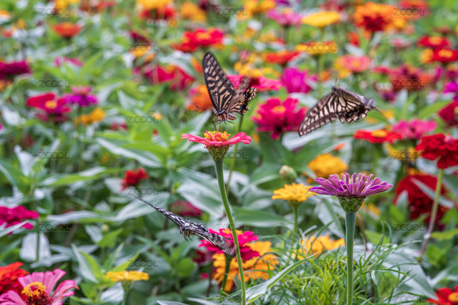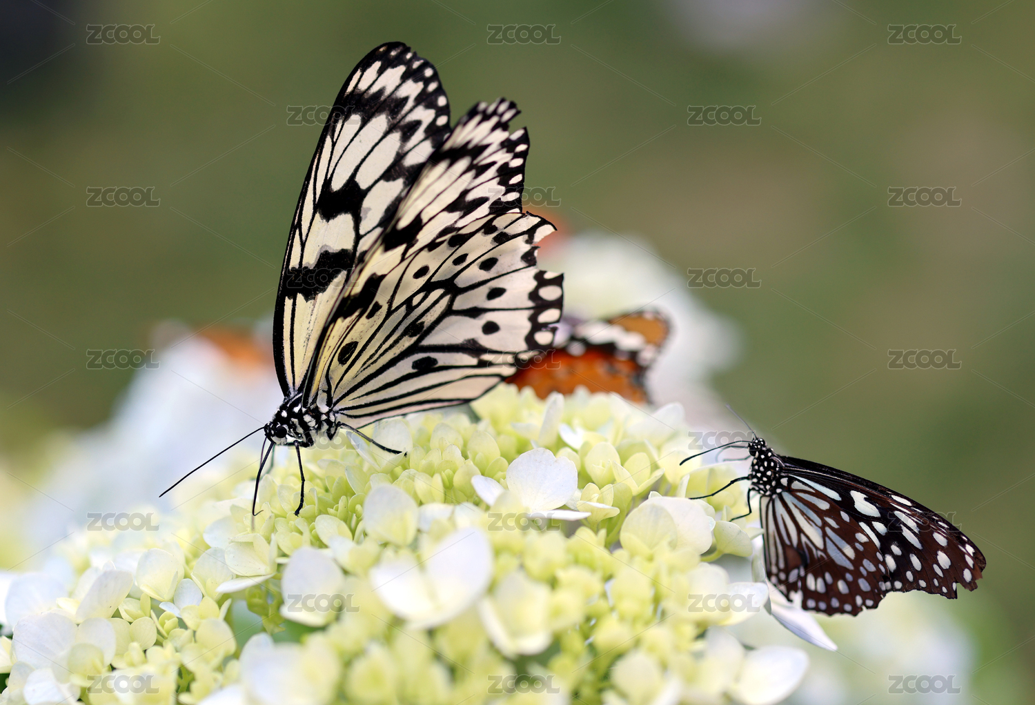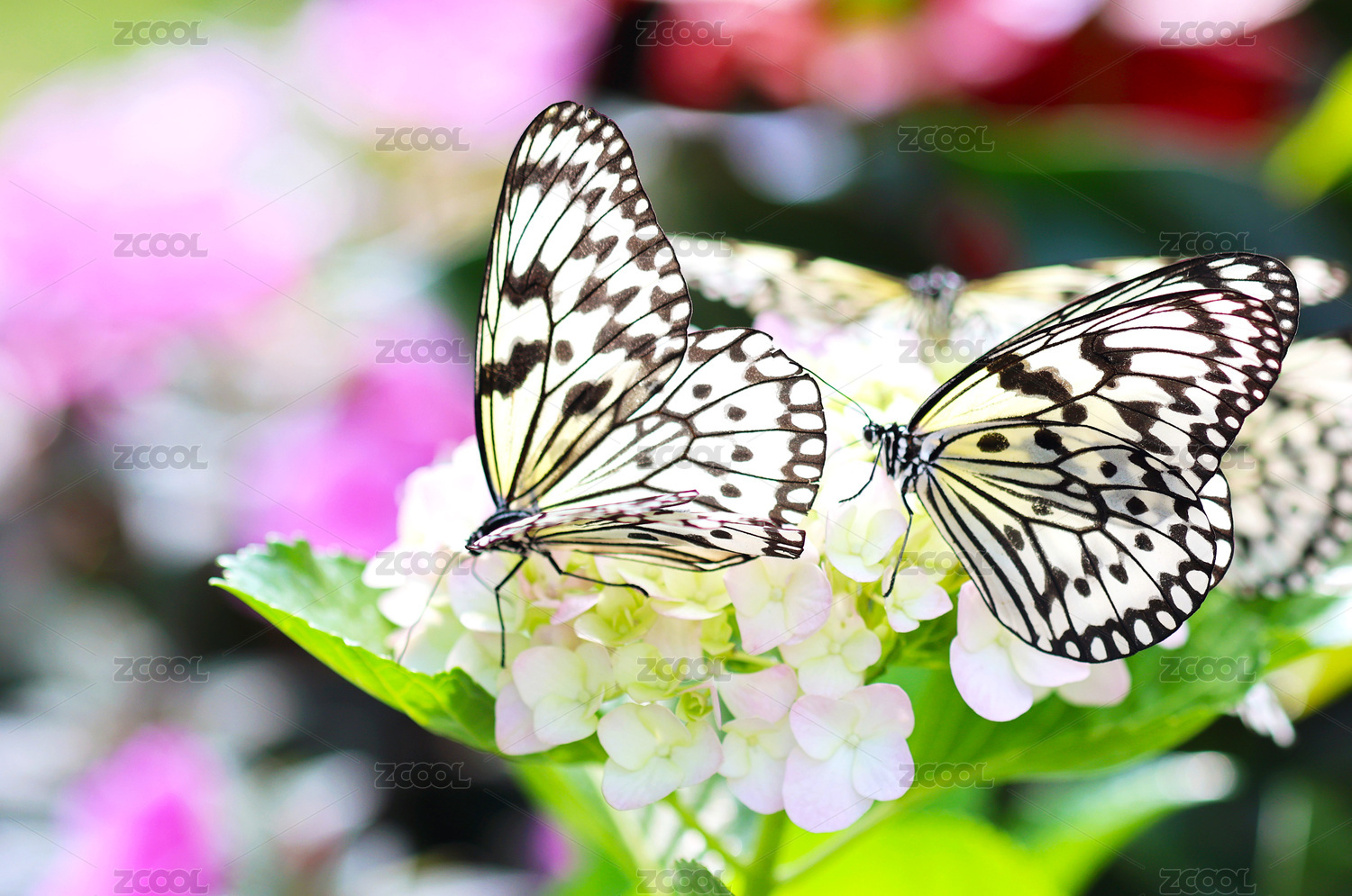 春天花园里彩色绣球鲜花彩蝶和竹篮花篮