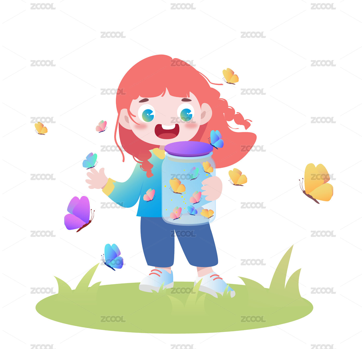 小女孩在草地上放飞玻璃罐里的彩蝶