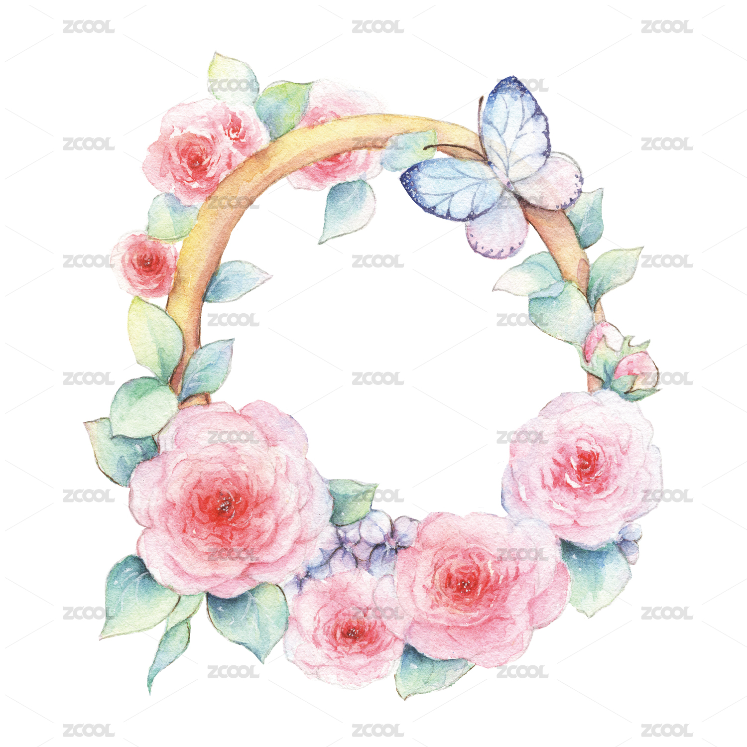 清新治愈大自然彩蝶与粉色鲜花花环装饰插画