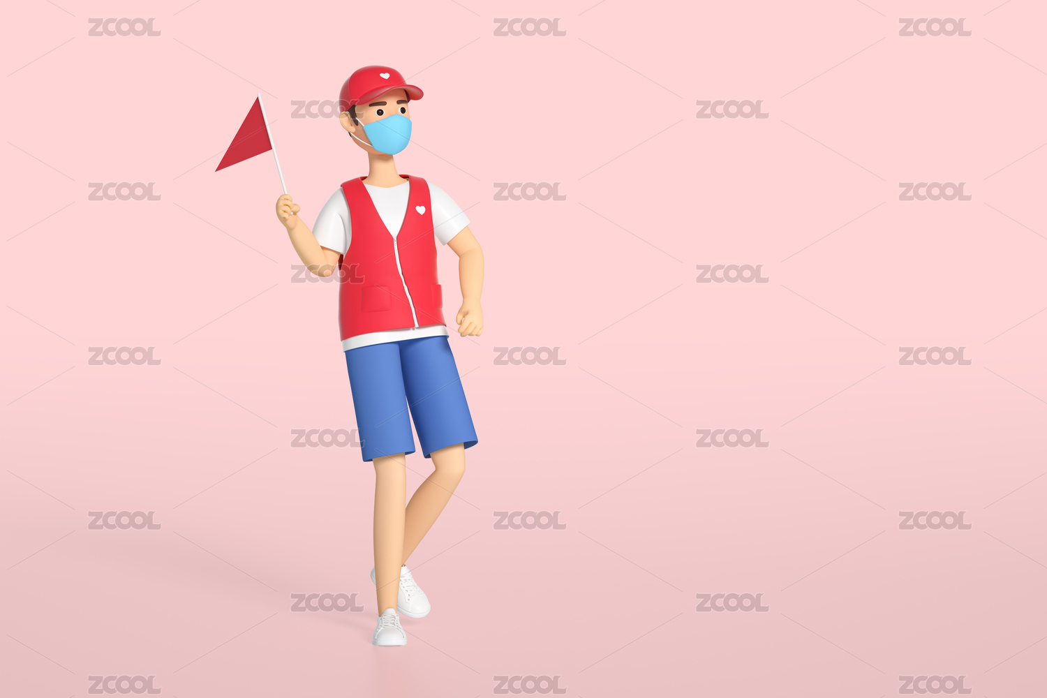 3D渲染举小红旗的志愿者