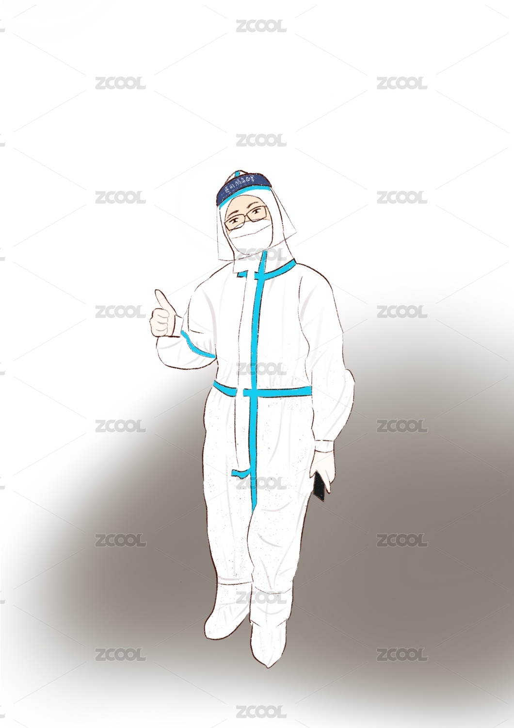 身穿防护服的防疫志愿者,做加油打气的手势