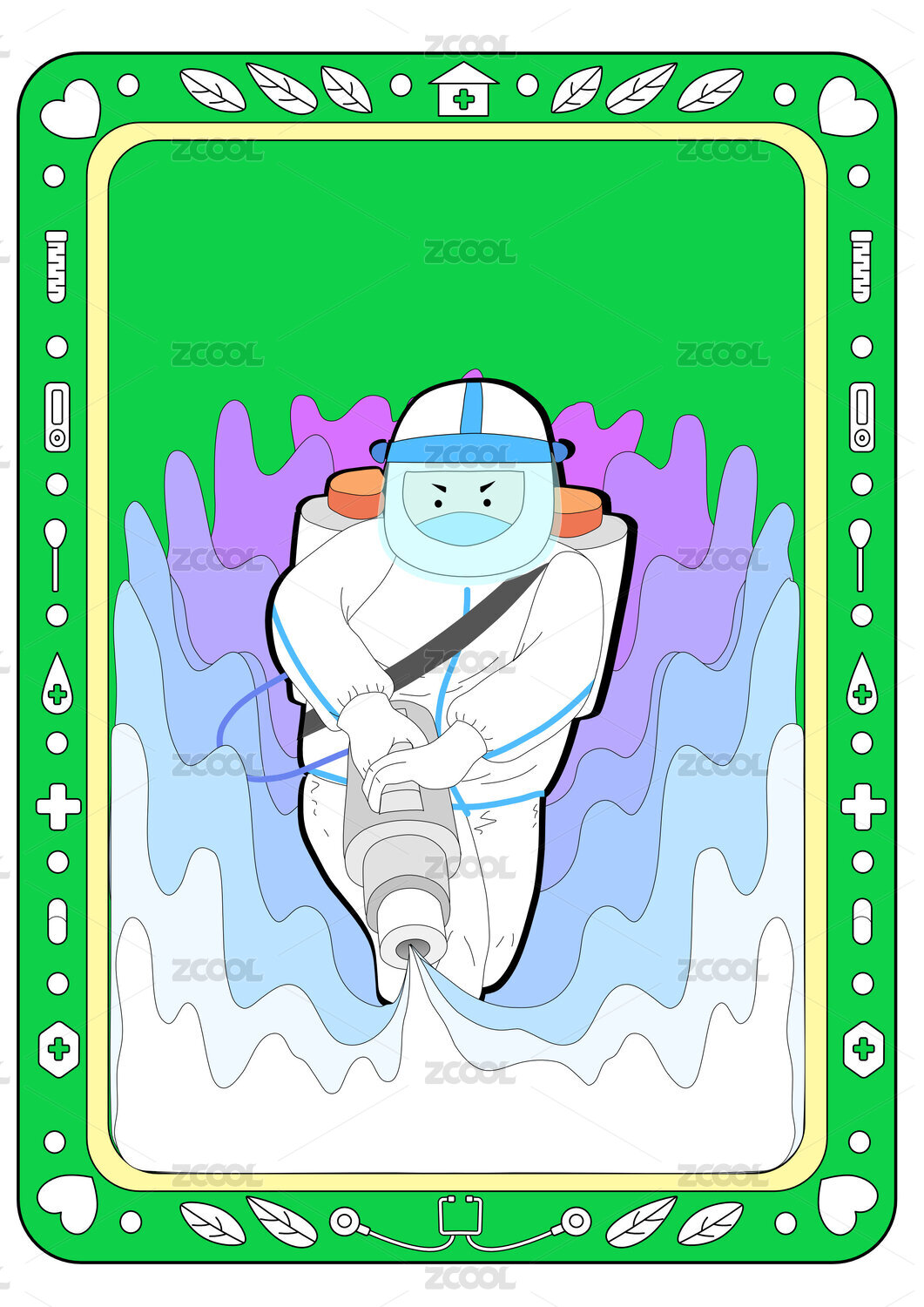 身穿防护服的防疫志愿者,手拿喷壶灭菌消杀