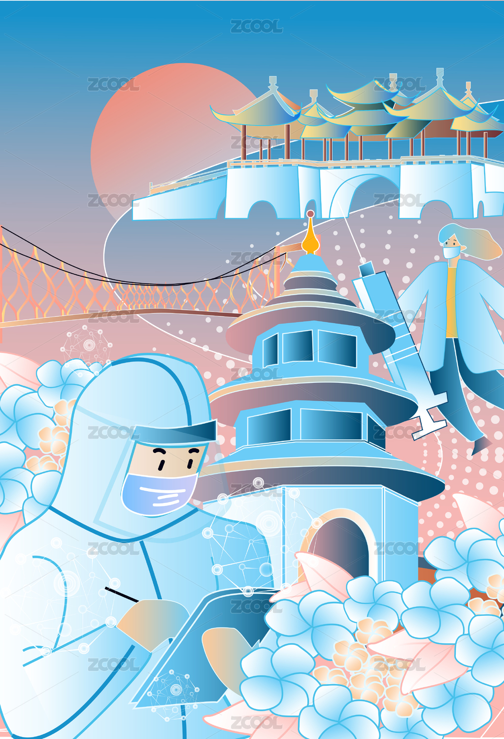穿着防护服的志愿者在登记新冠疫苗插画