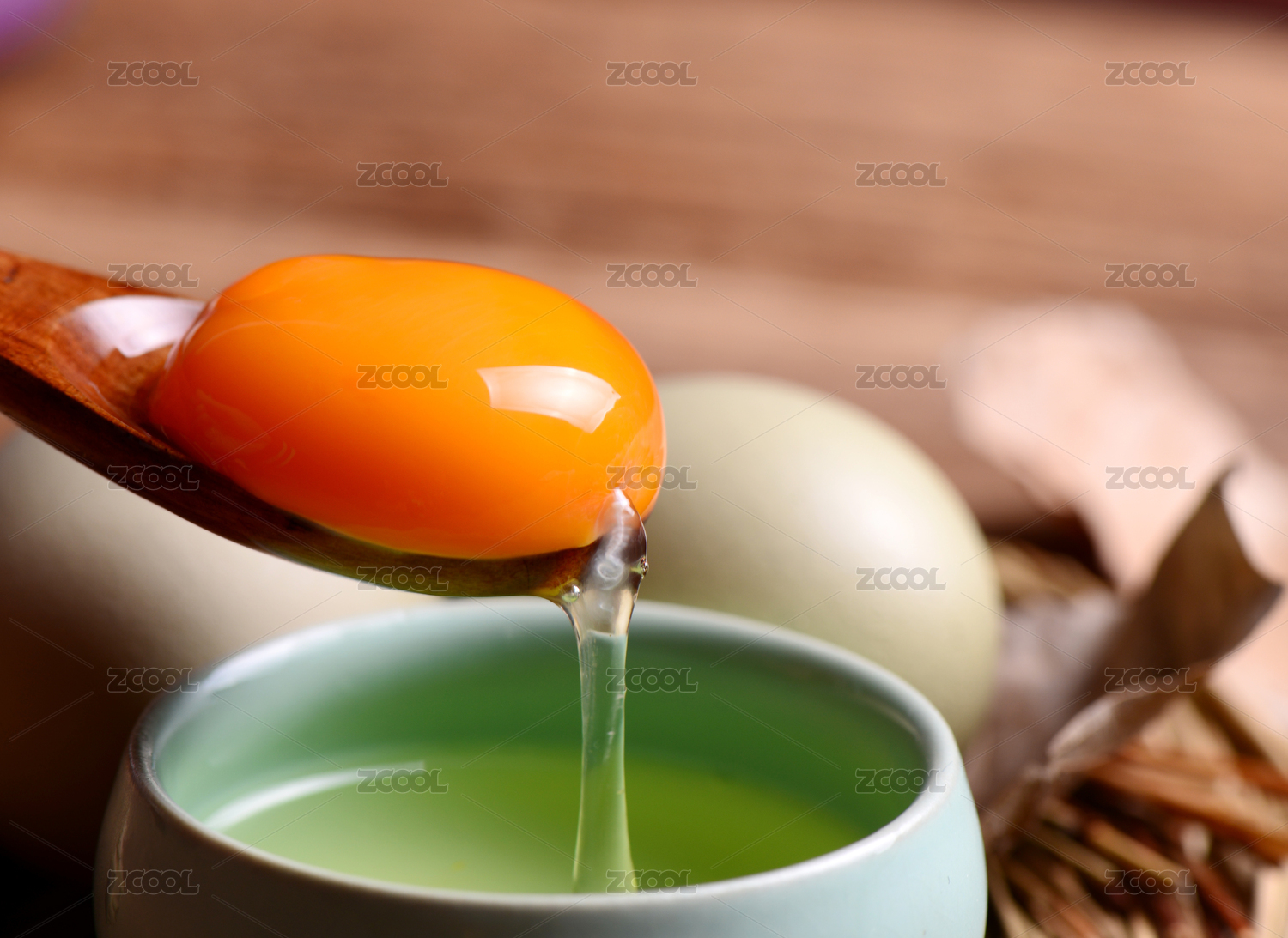 木制勺子里盛放的新鲜鸡蛋黄