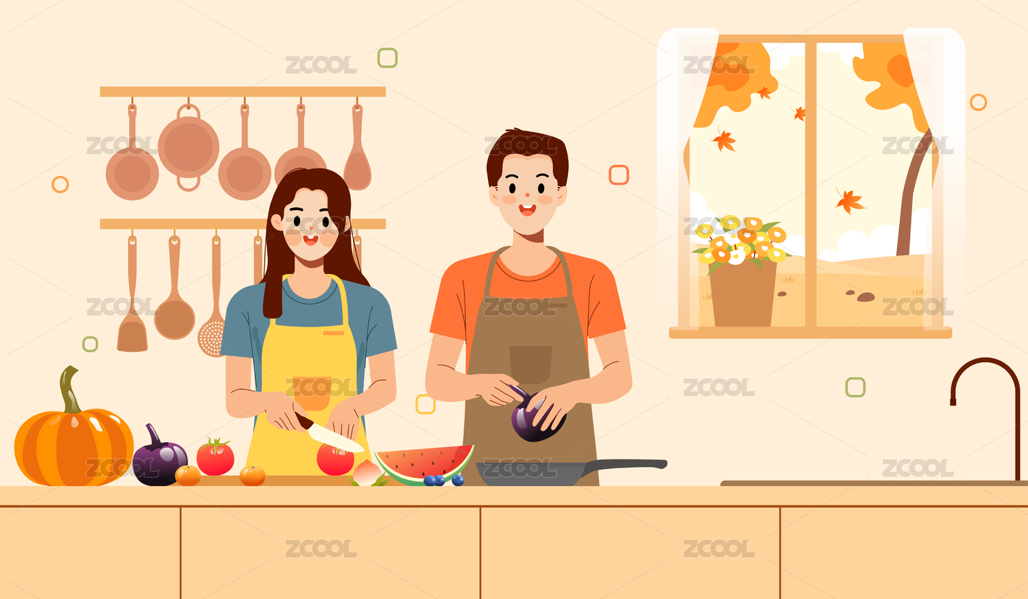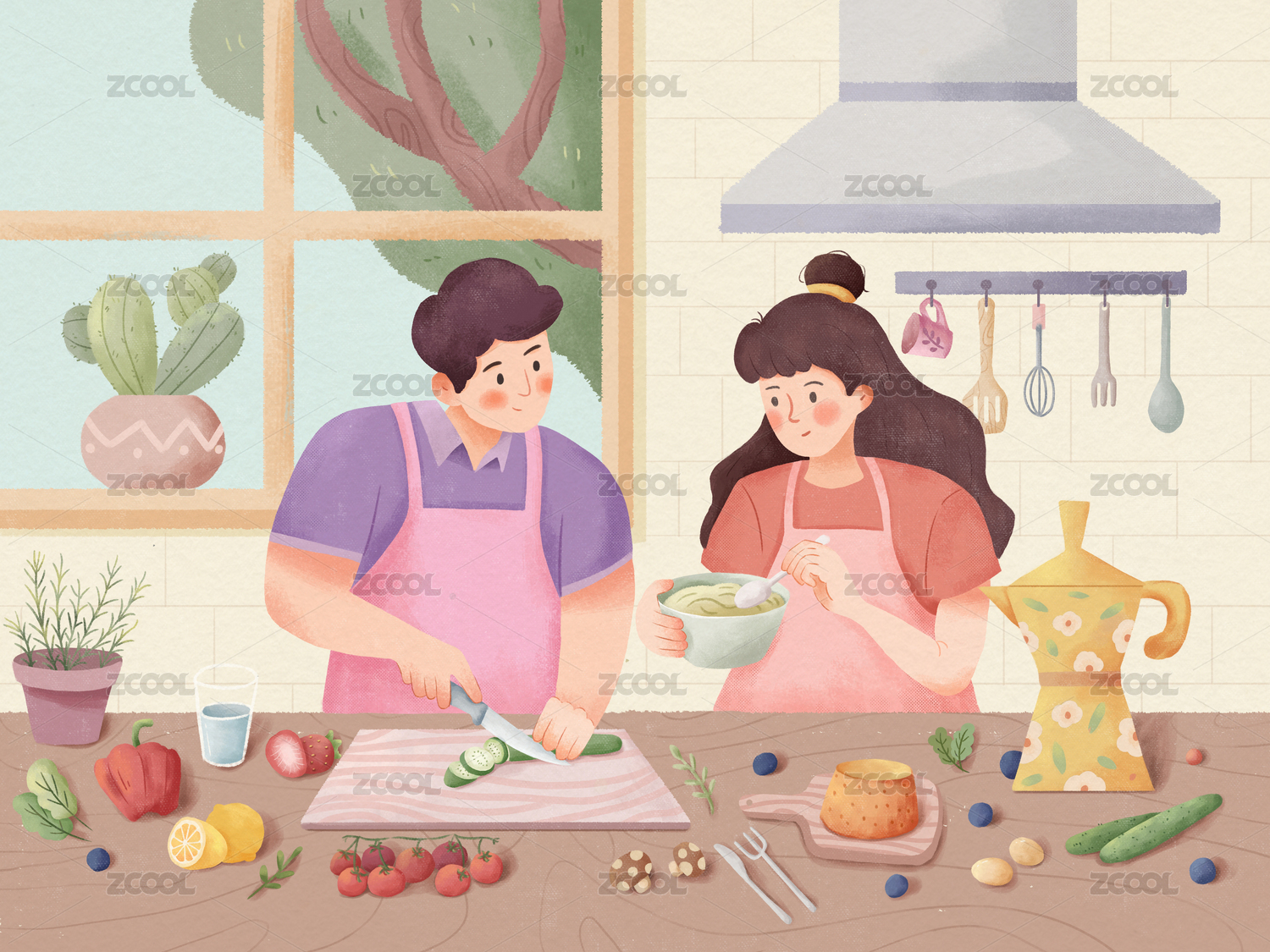 情侣厨房一起做饭烹饪美食健康餐饮饮食插画