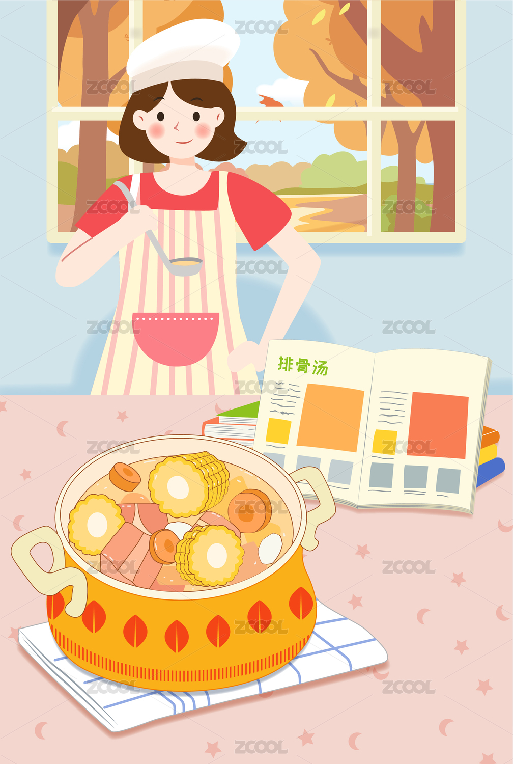 女孩居家做饭厨房玉米排骨汤居家插画