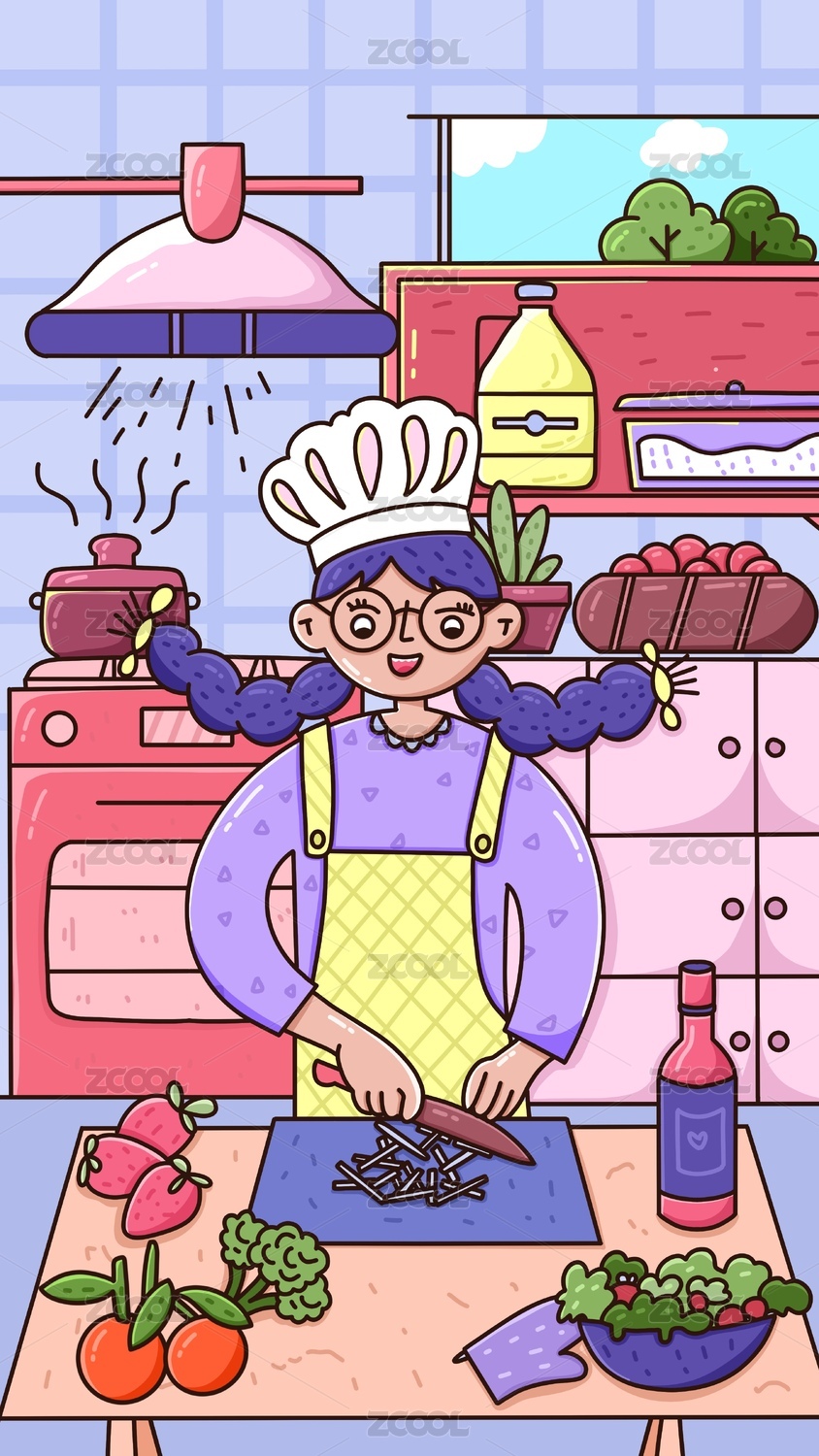 清新女孩做饭场景插画