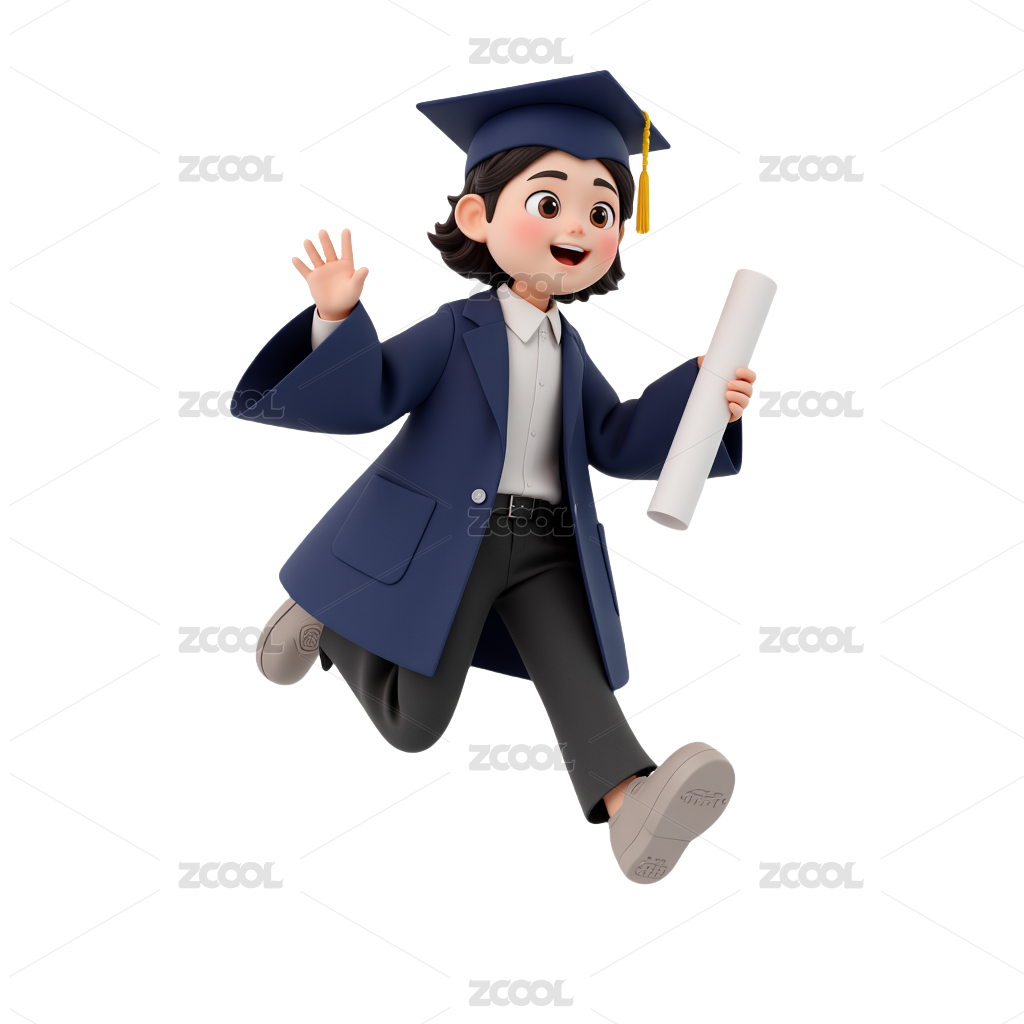 毕业主题插画穿着学士服滑滑板的男孩和手拿