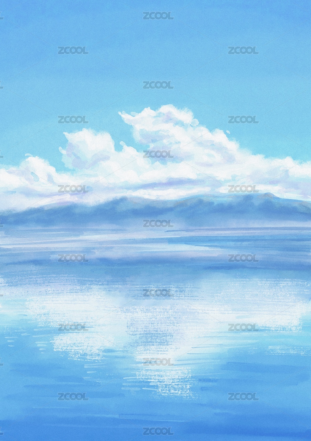 蓝天白云水面卡通动漫插画