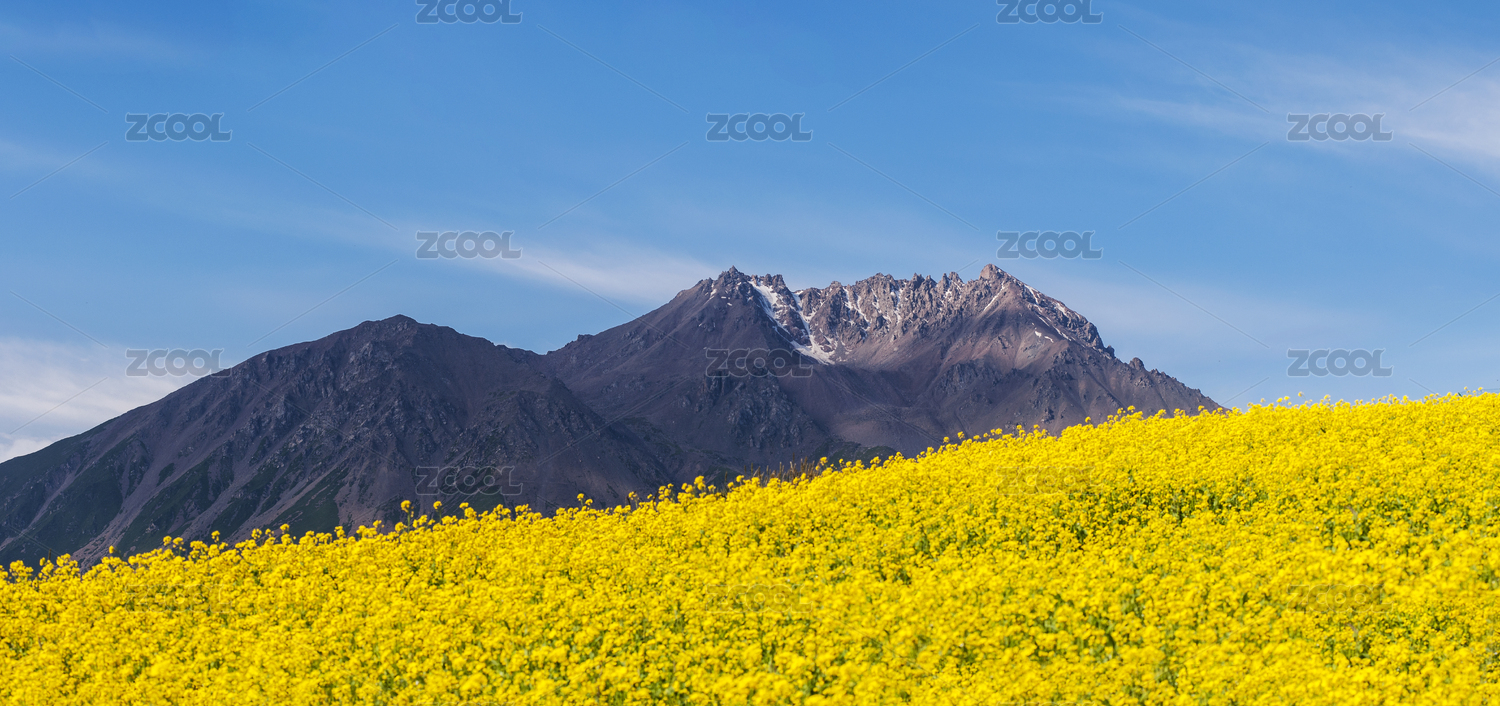 中国青海省祁连山高原雪山下的油菜花
