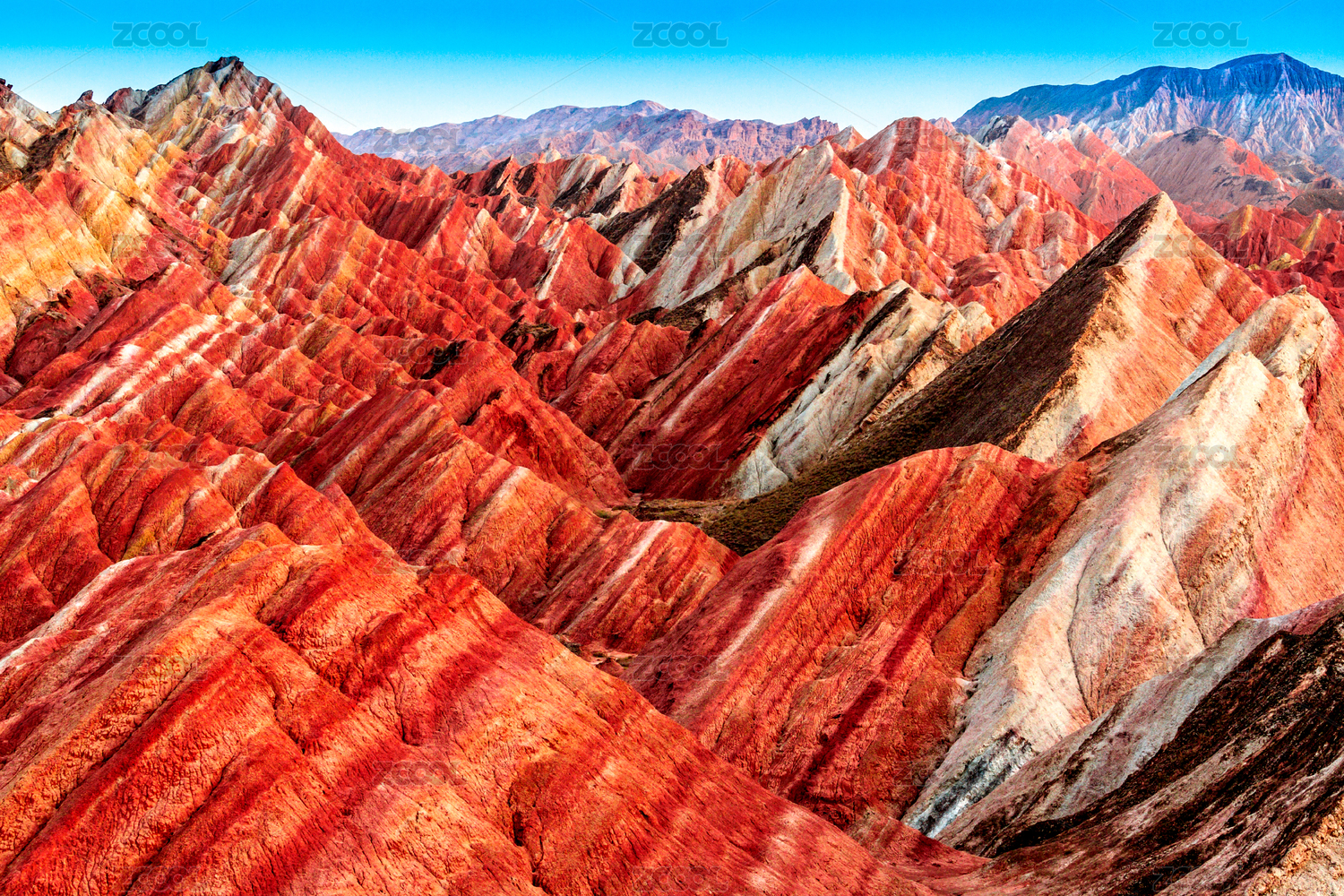 秋季蓝天下的甘肃张掖七彩丹霞地貌群纹路