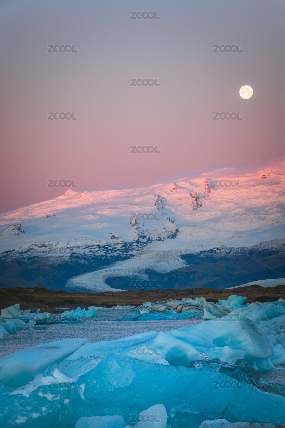 梦幻而震撼的冰岛杰古沙龙冰河湖粉色日出与蓝色冰川月亮风光