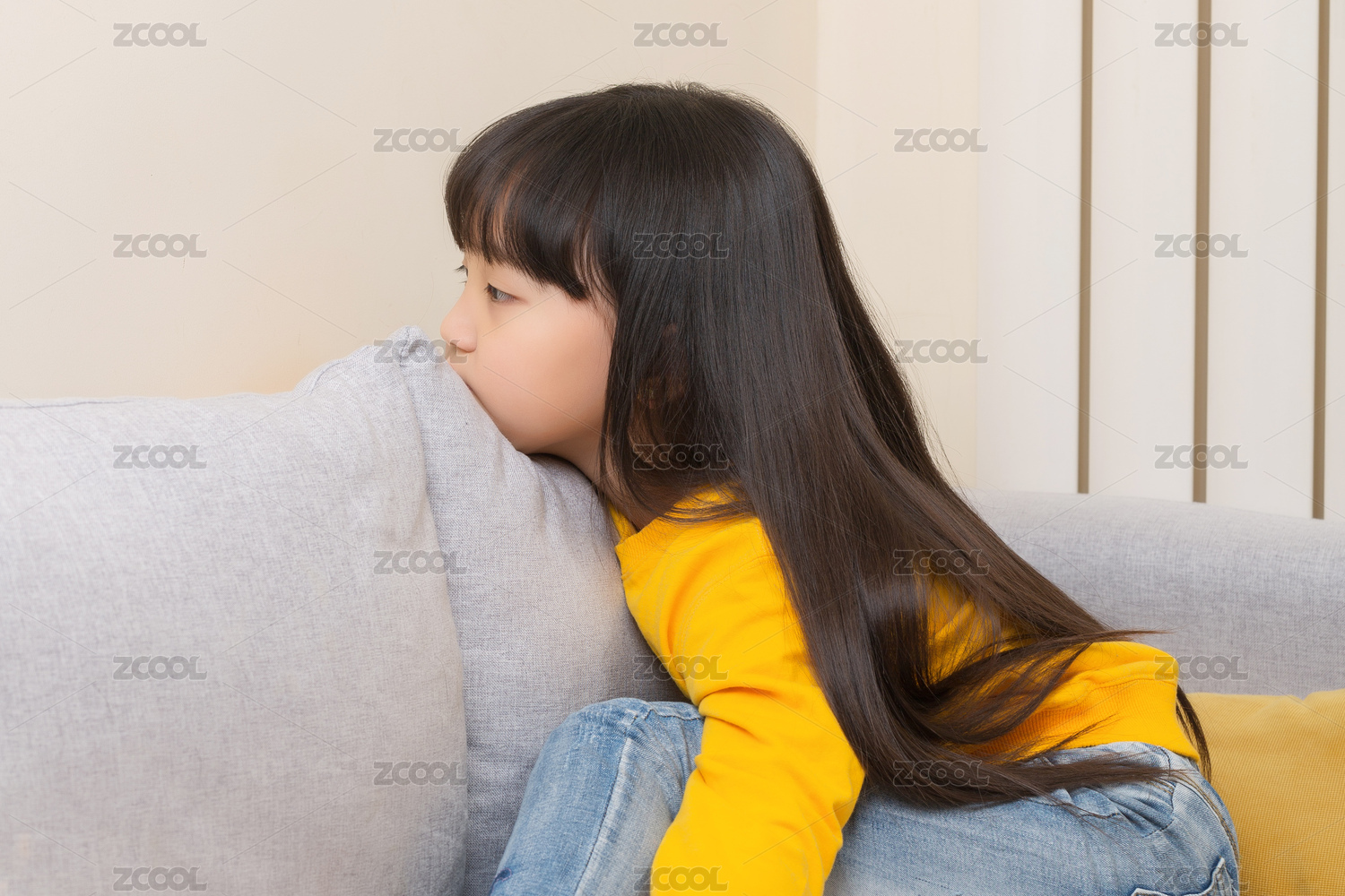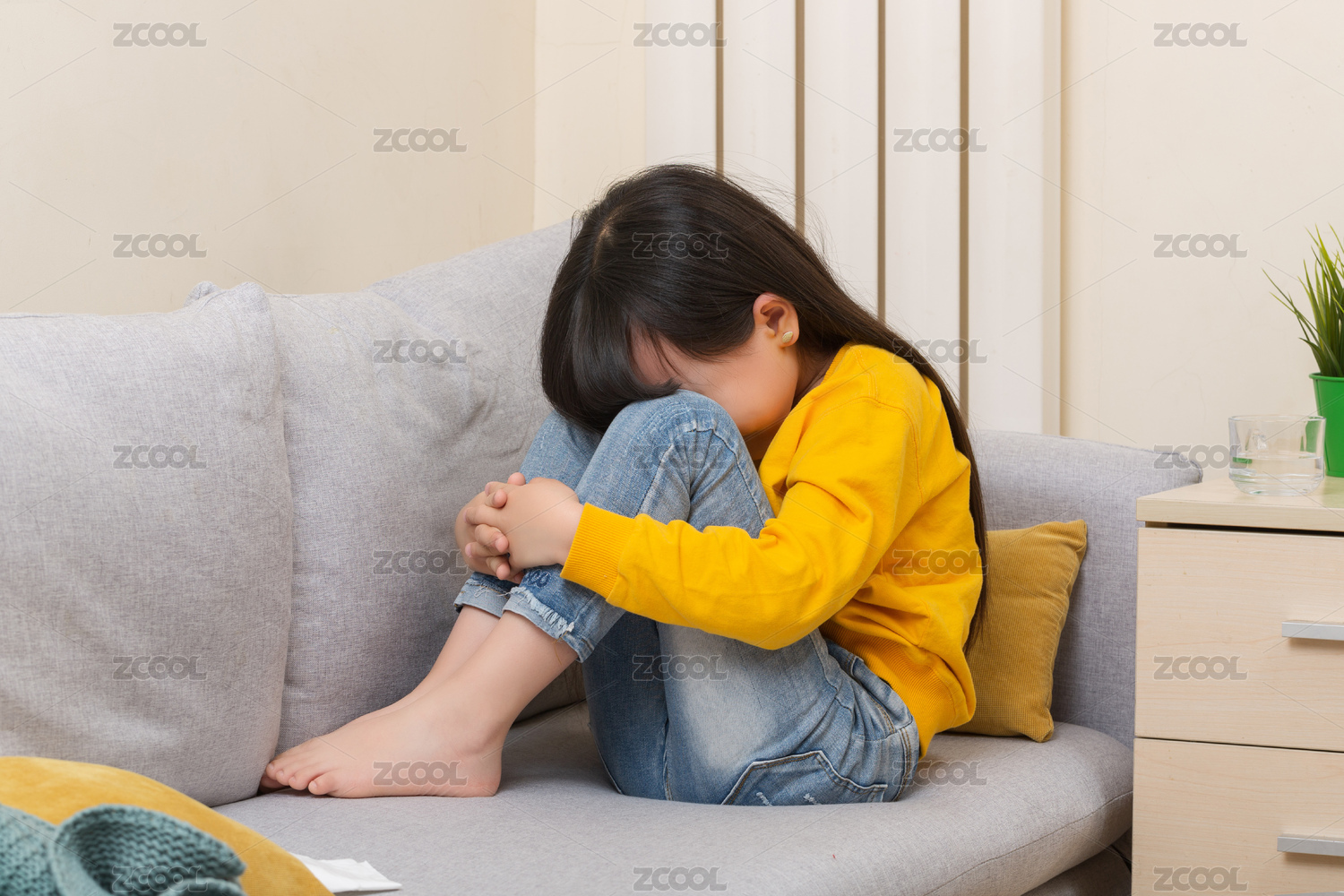蜷缩在沙发上伤心哭泣的亚洲小女孩