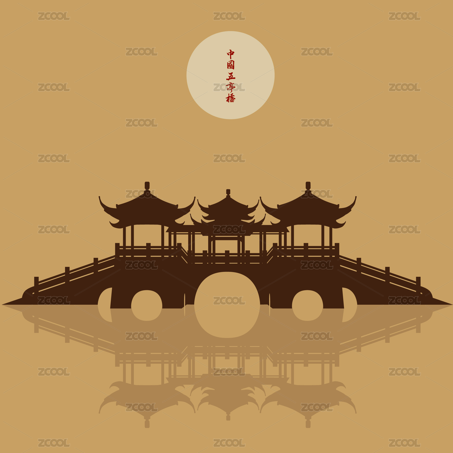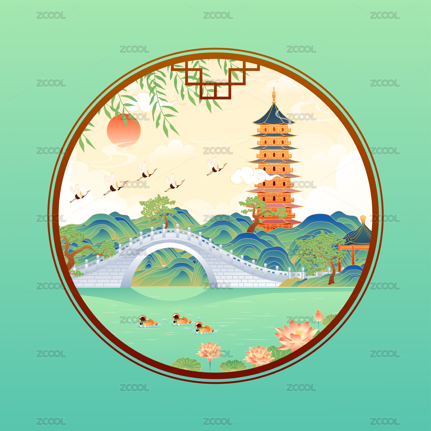国潮风江苏扬州瘦西湖二十四桥矢量插画