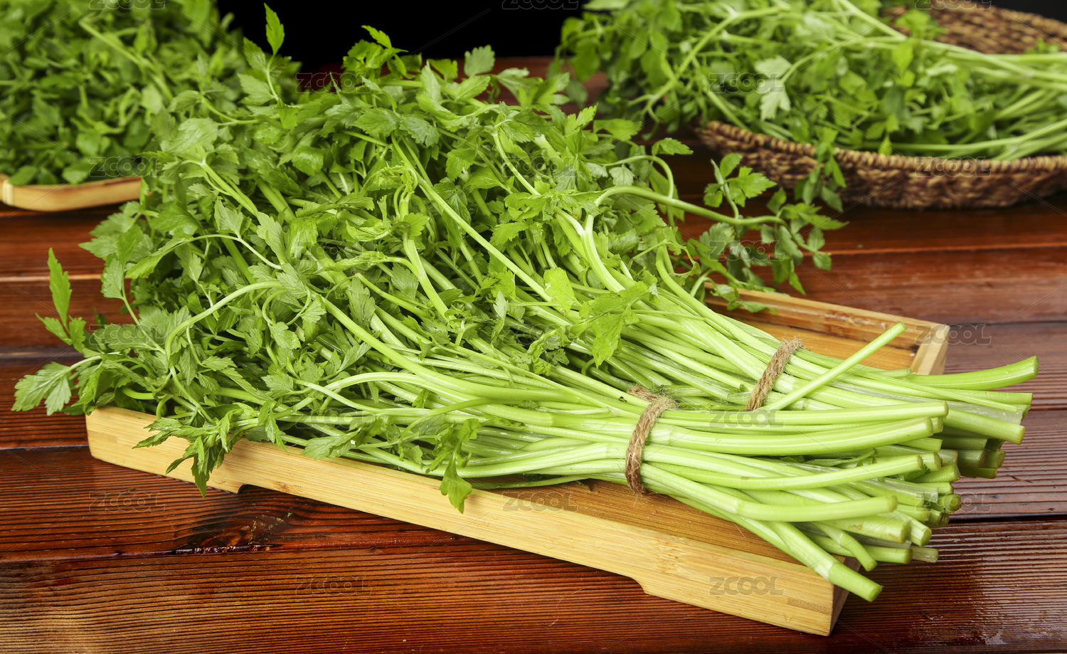 木底上木盘里放着一堆湖北野生水芹菜