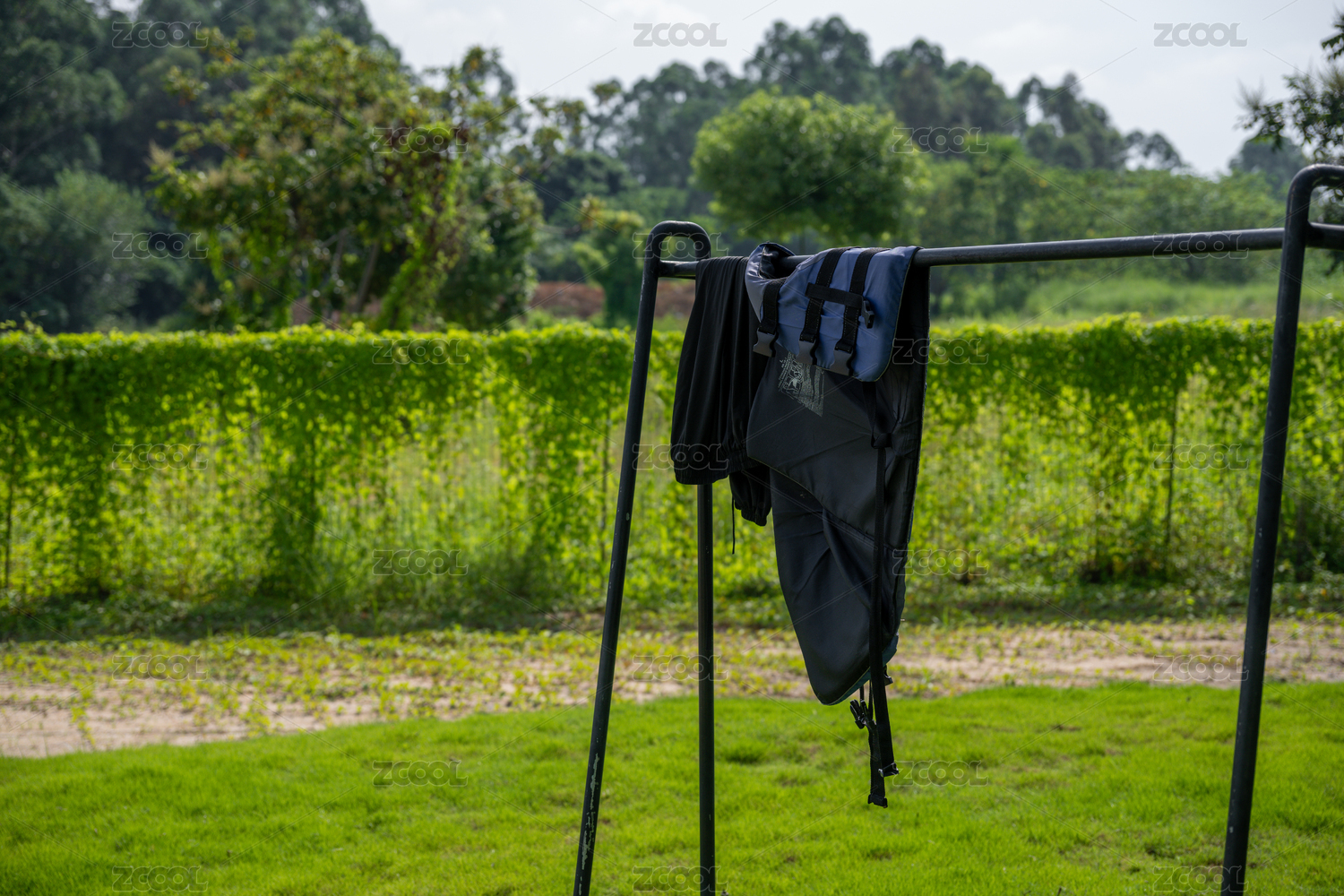 户外草地上的背包和装备