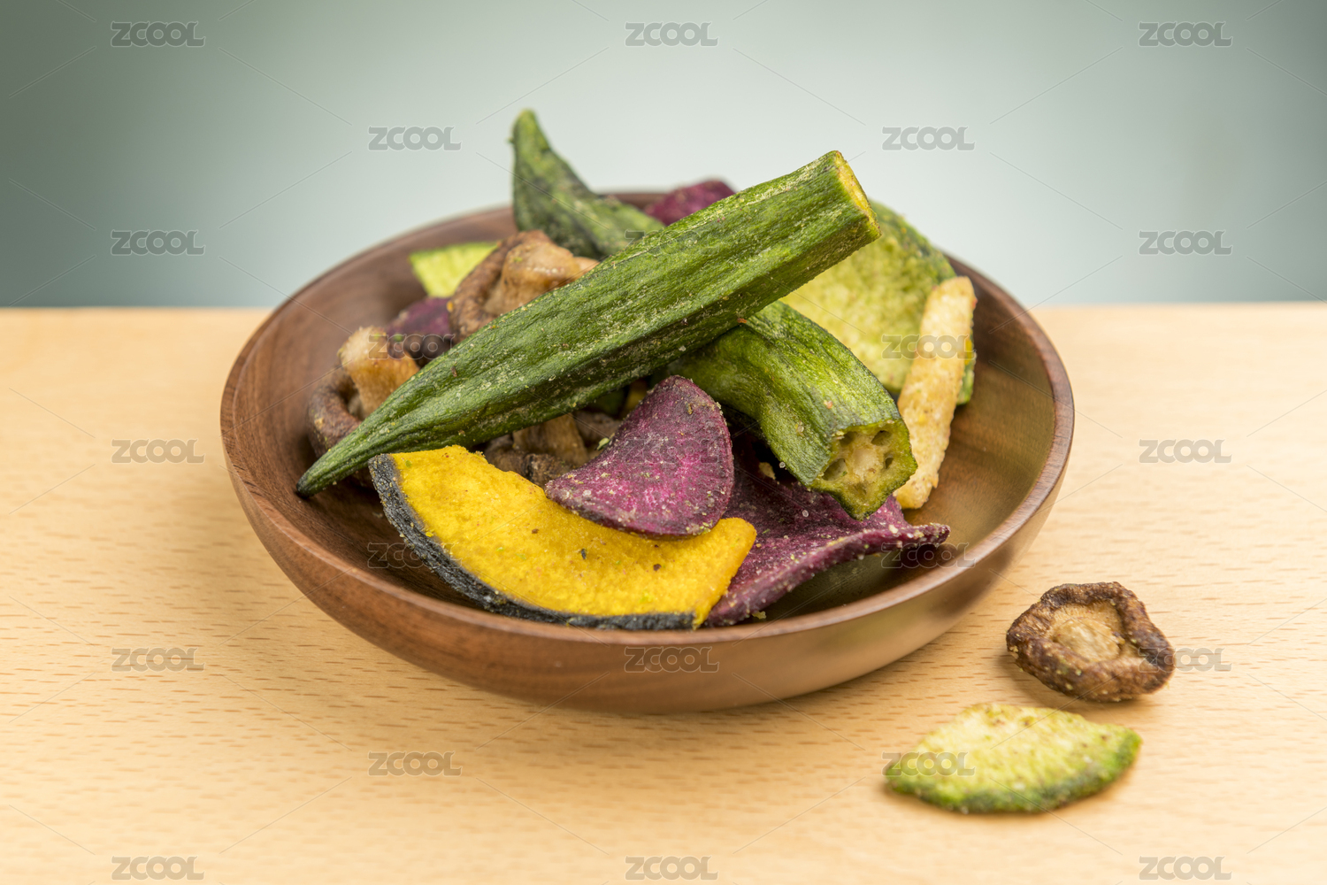 一碗蔬菜干蔬菜脆摆放在木桌面上特写