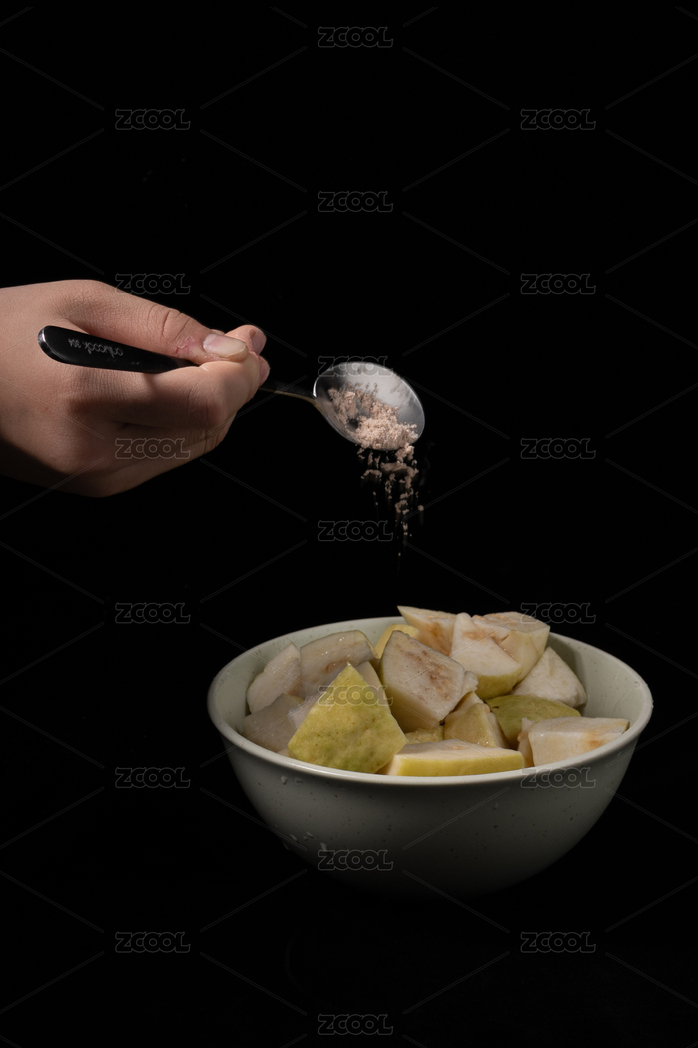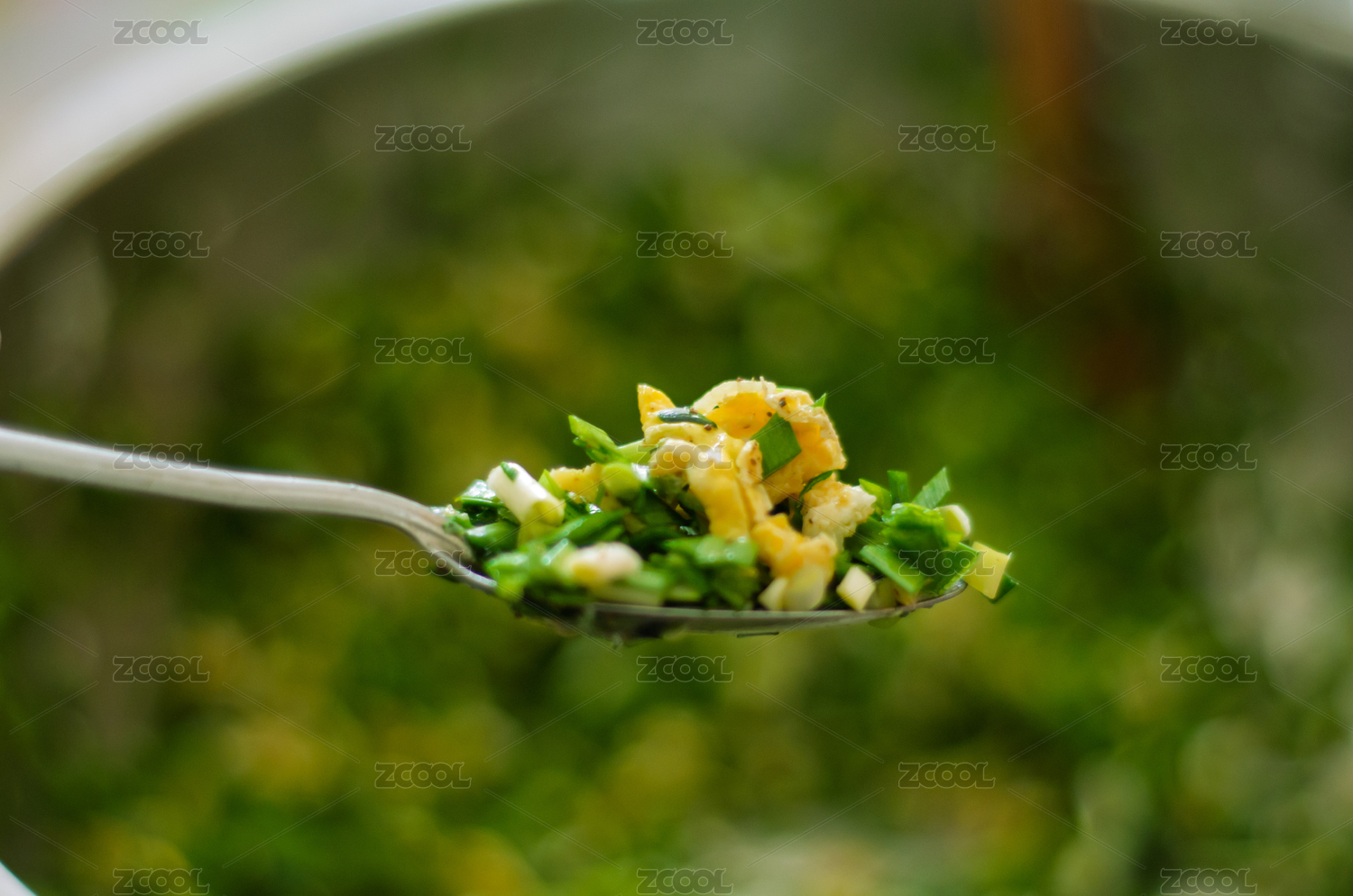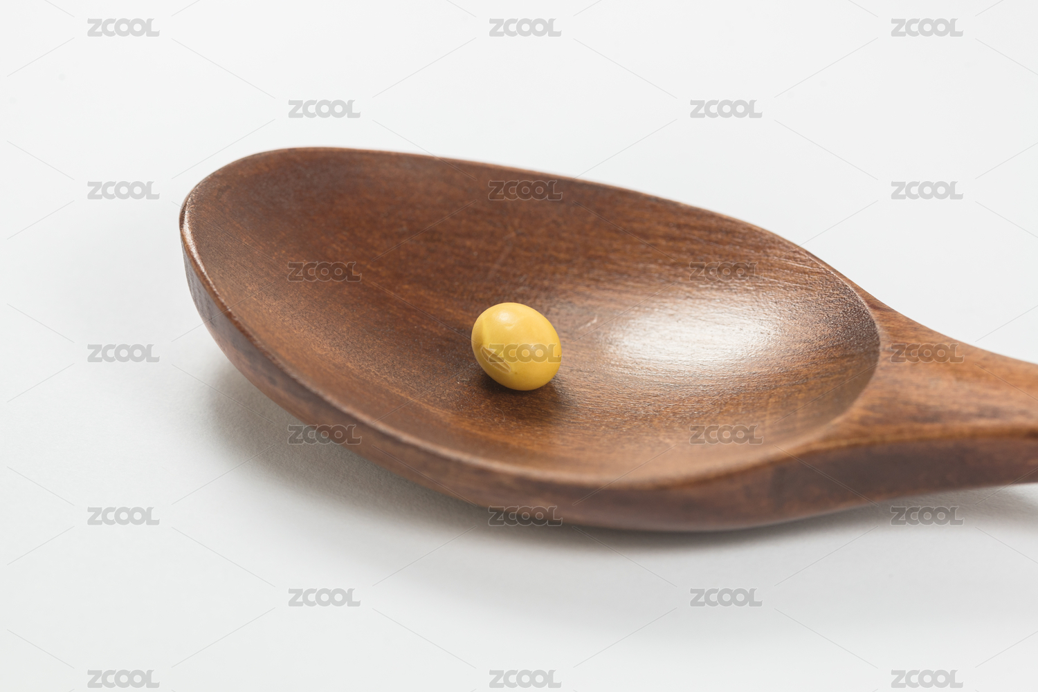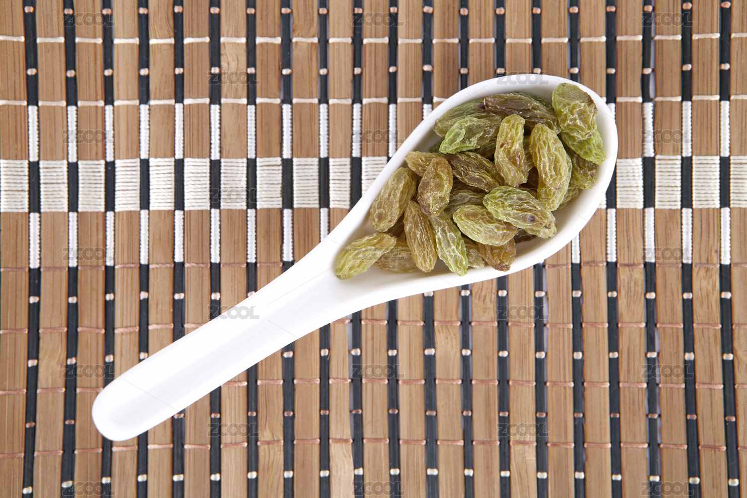 米黄色餐桌布上的勺子,勺子里的咖啡豆