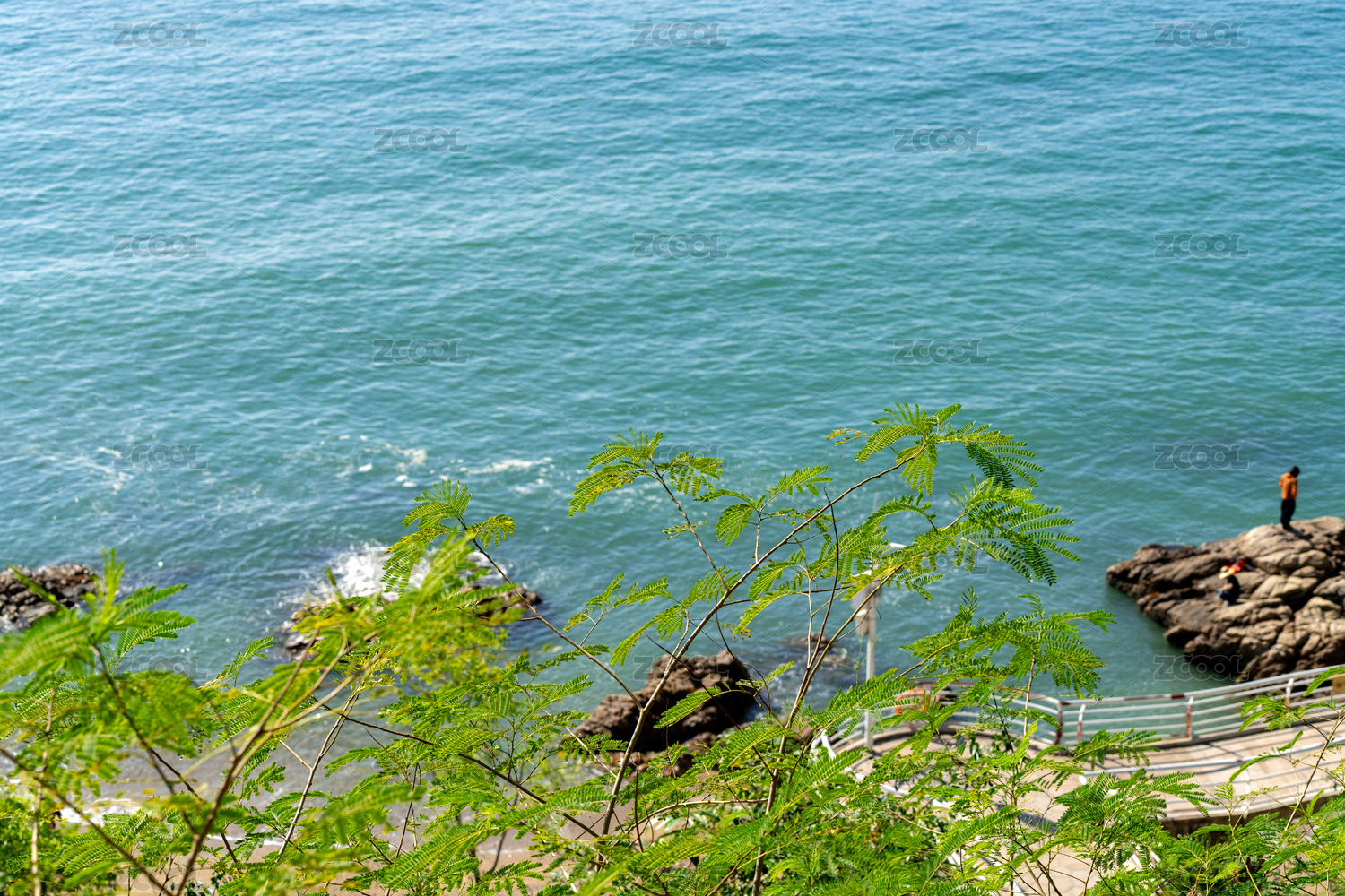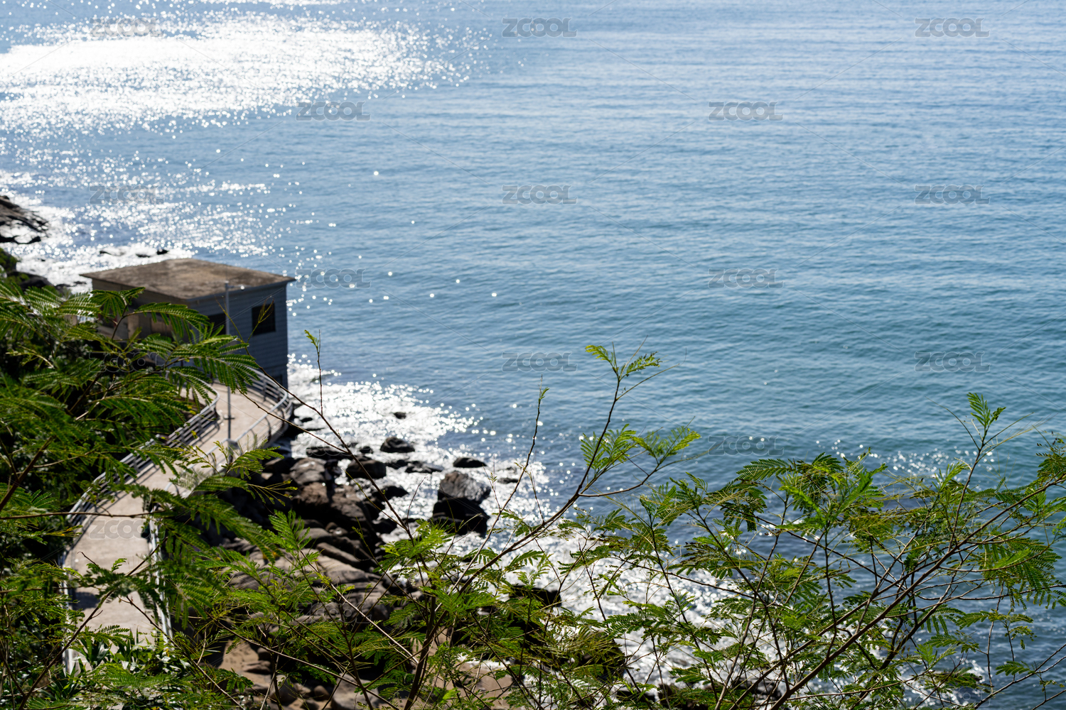 波光粼粼的平静海面和生长茂盛的绿植树木