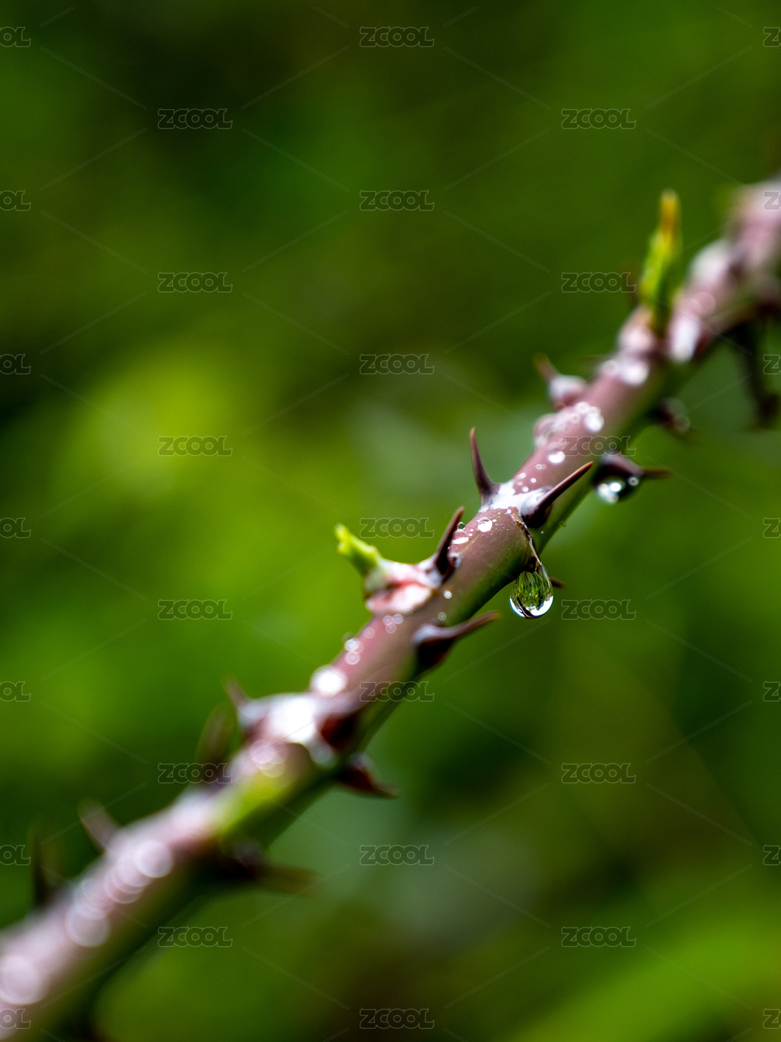 带刺的玫瑰刺和新叶特写背景绿色虚化
