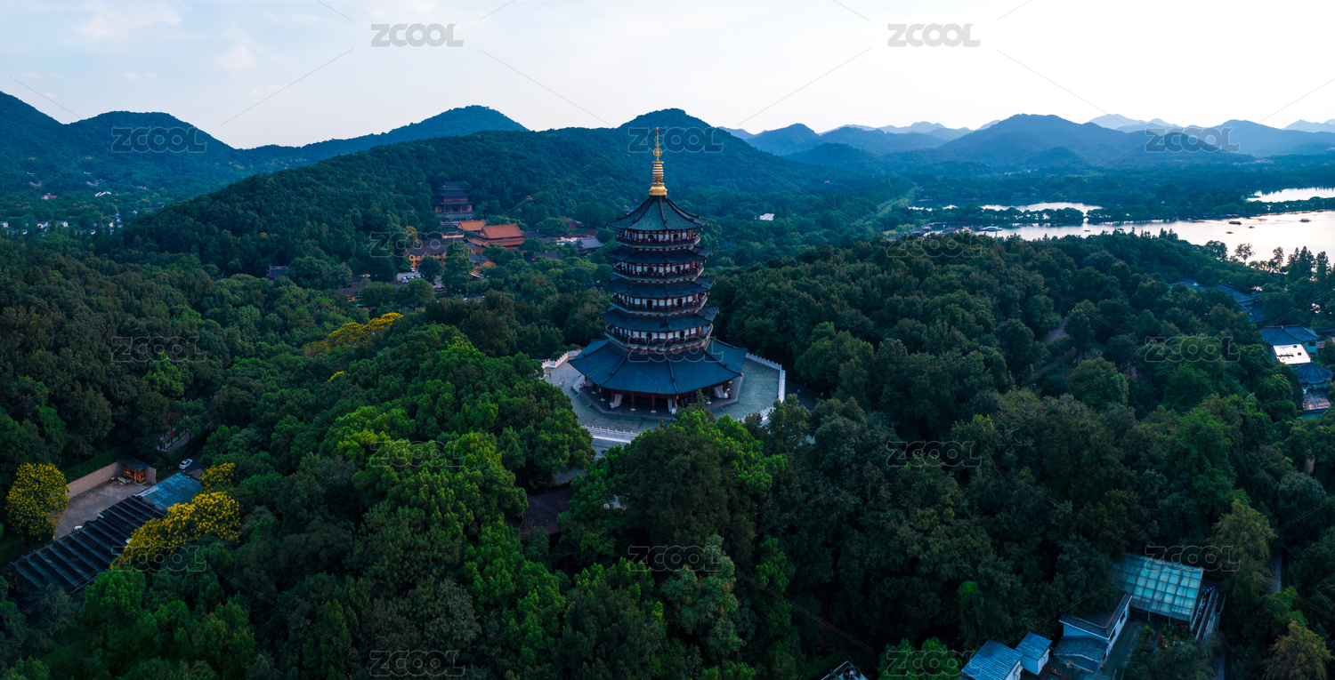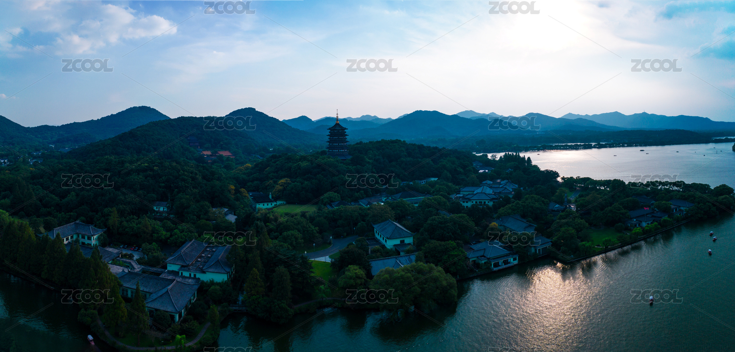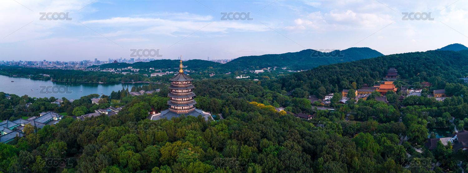 全景航拍杭州西湖雷峰塔风景区