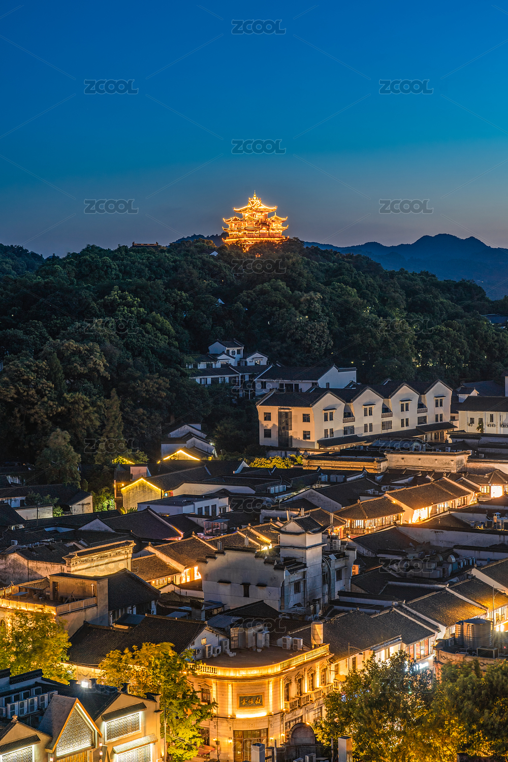 中国浙江杭州旅游风光:吴山城隍阁和河坊街夜景