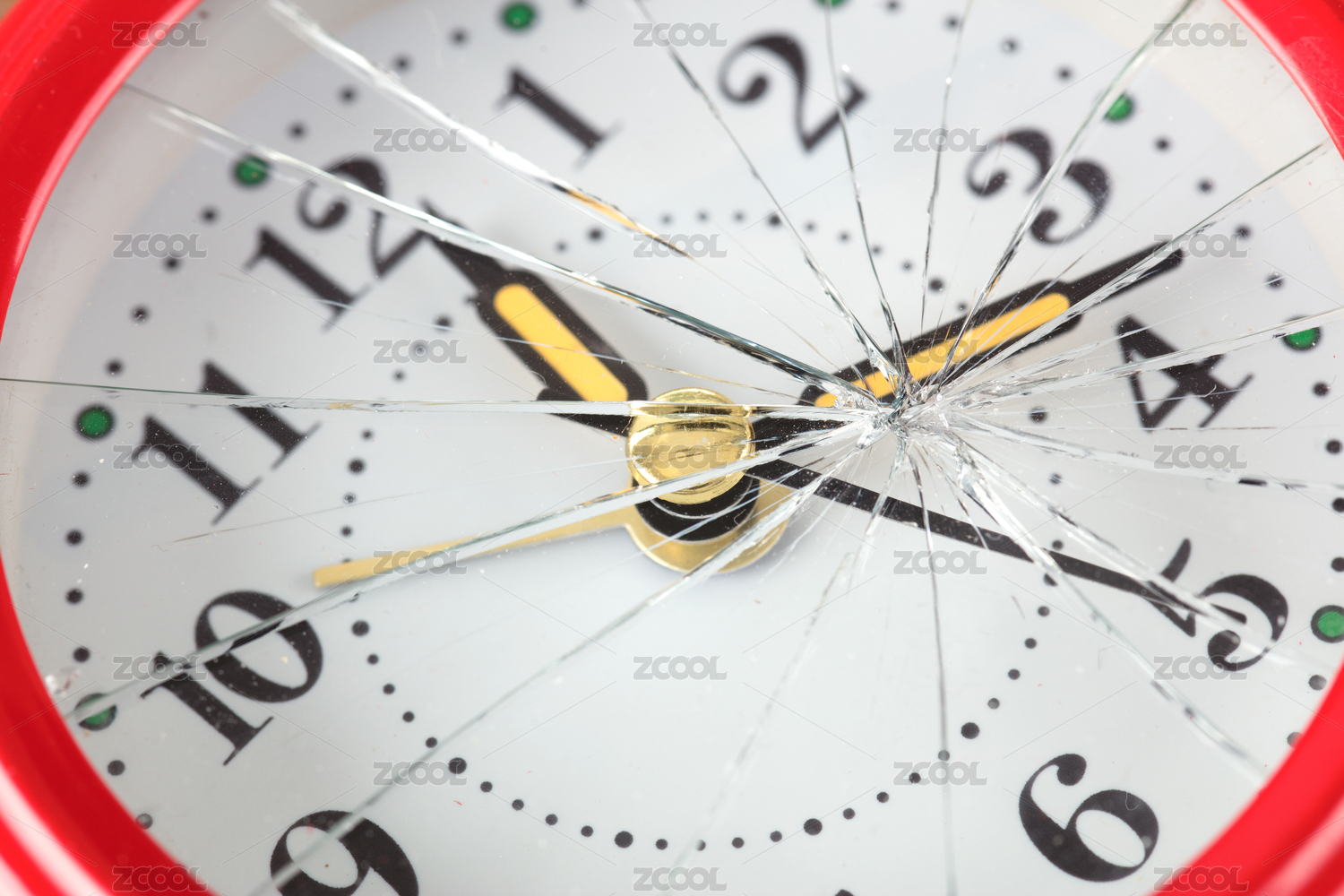 特写闹钟玻璃罩破碎的裂痕