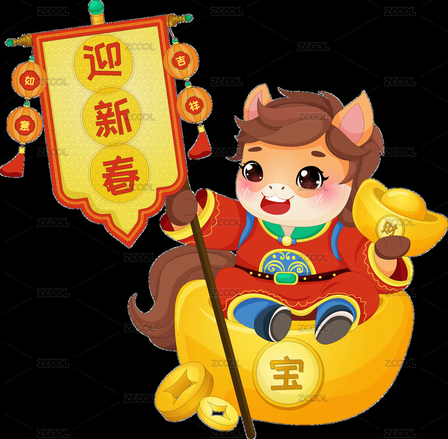 春节过年小马驹迎新春灯笼旗帜元宝节日插画