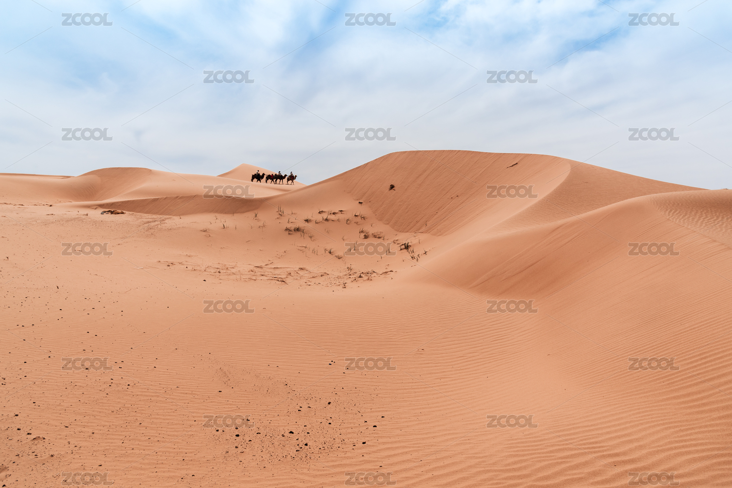 宁夏沙坡头国家级自然保护区沙漠区驼队走在沙漠上