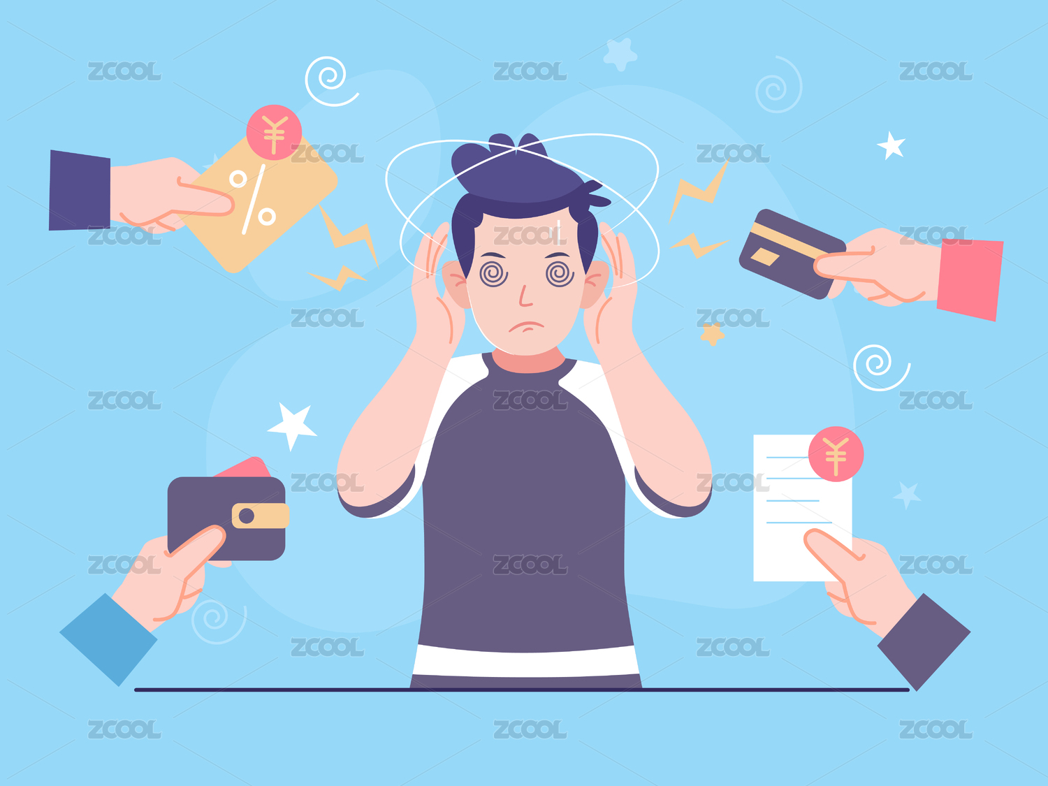 一个男生双手抱头四周是还款账单矢量插画