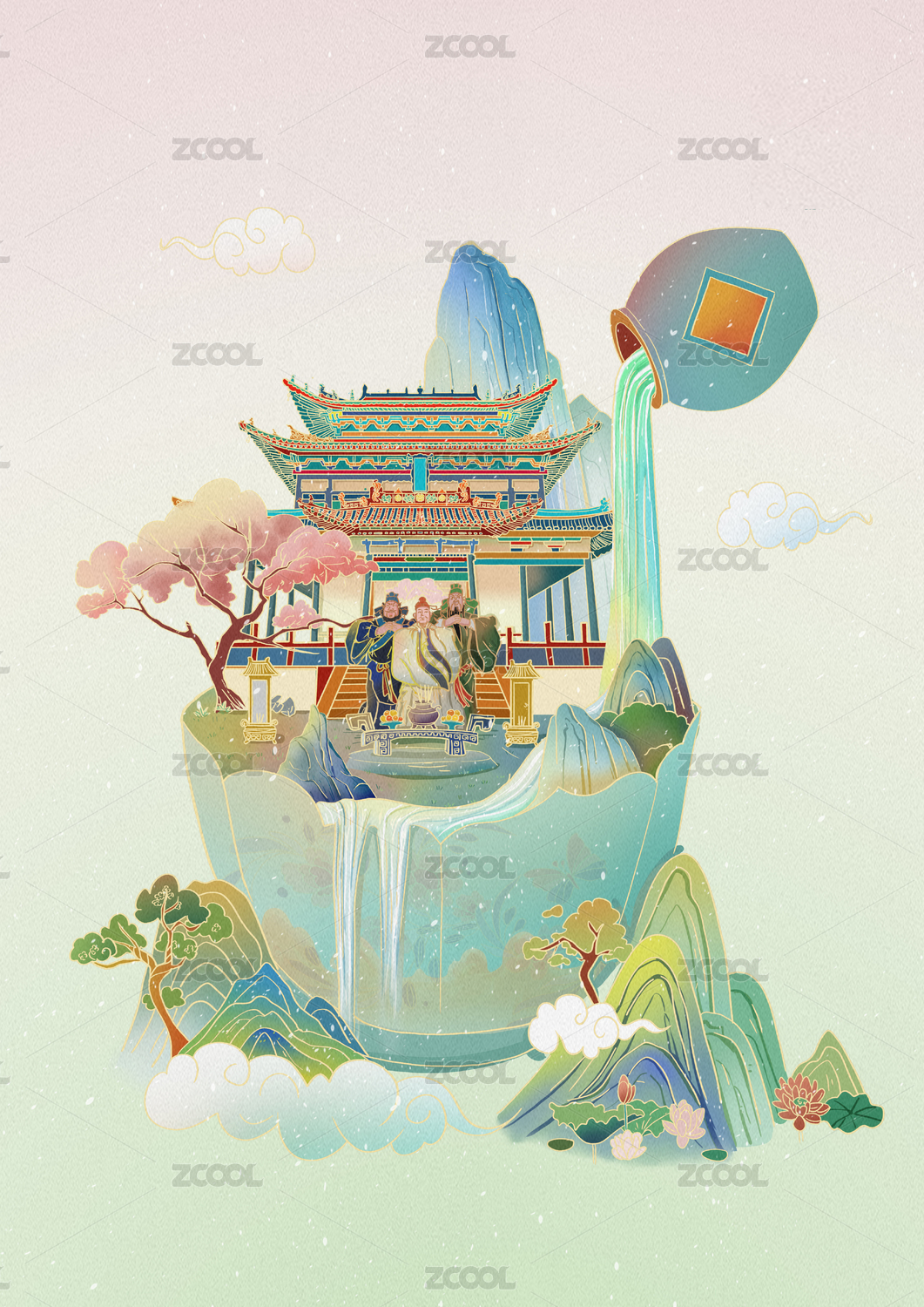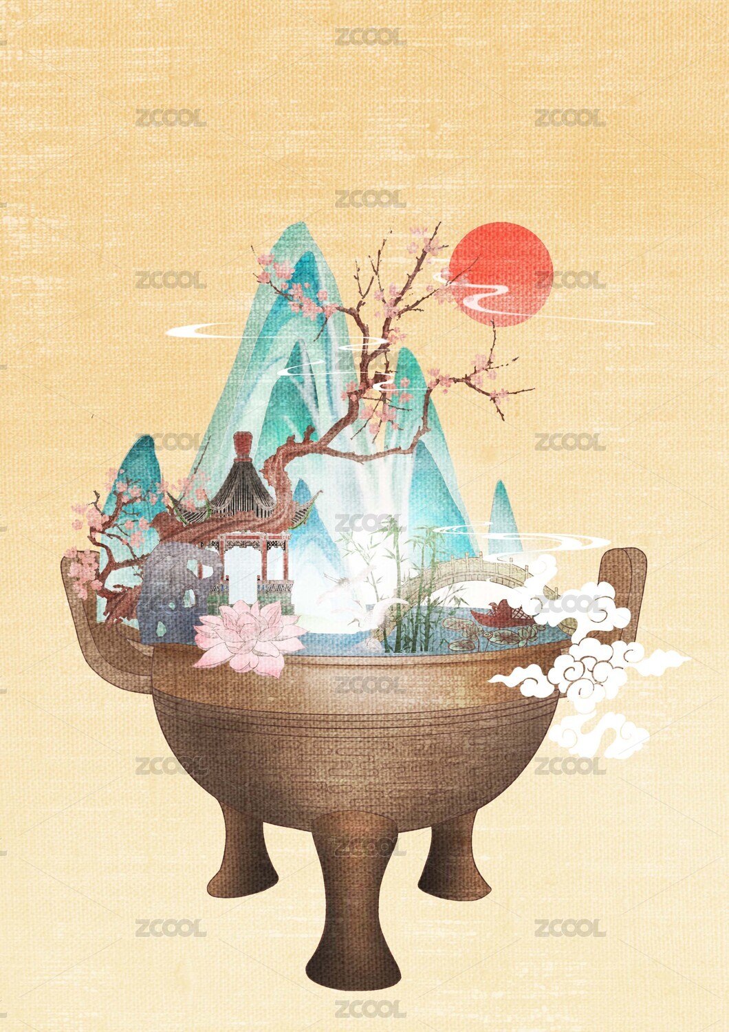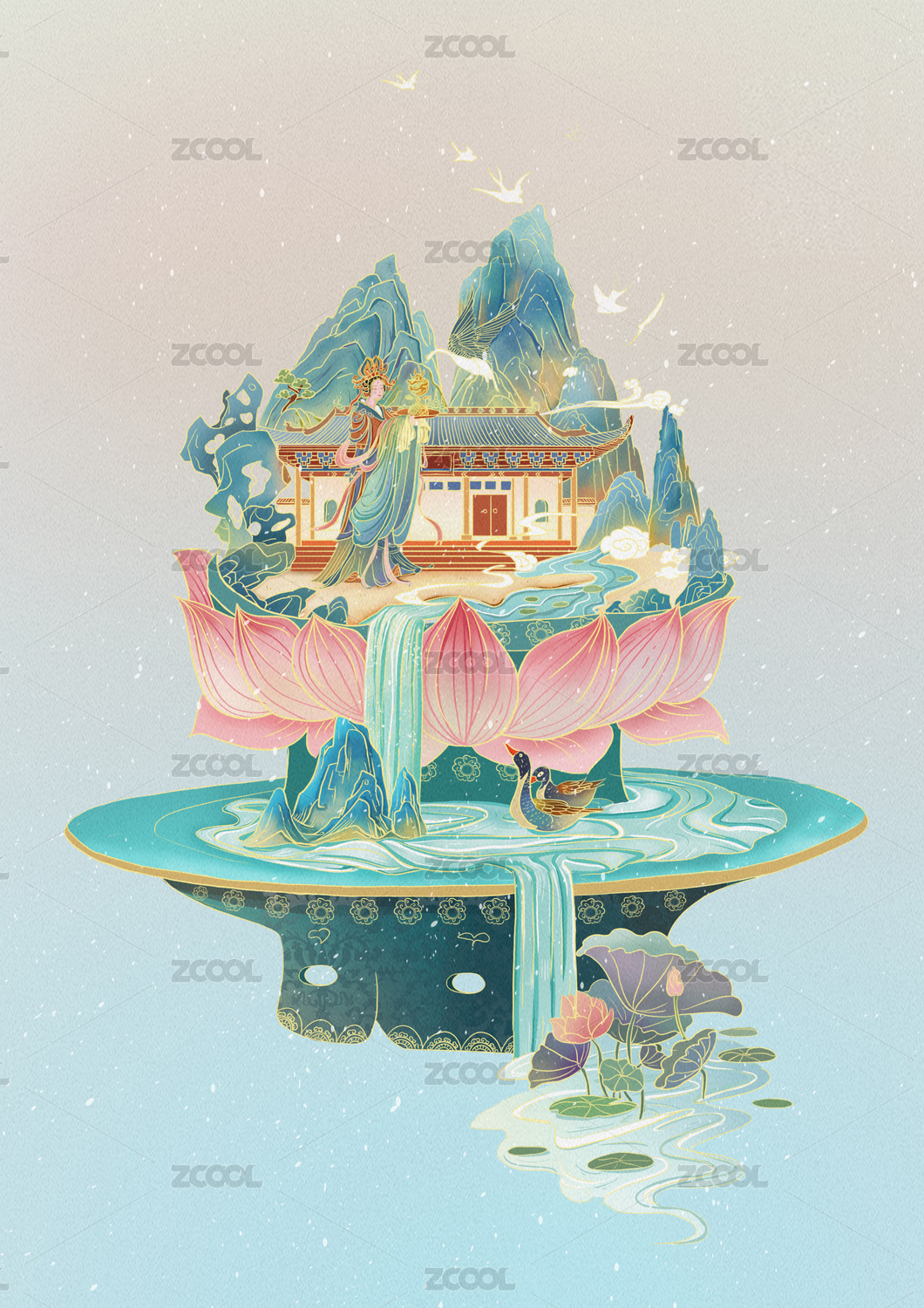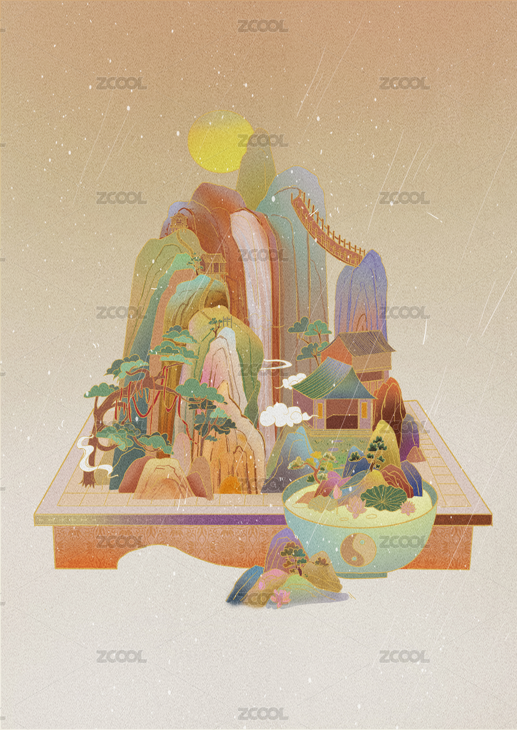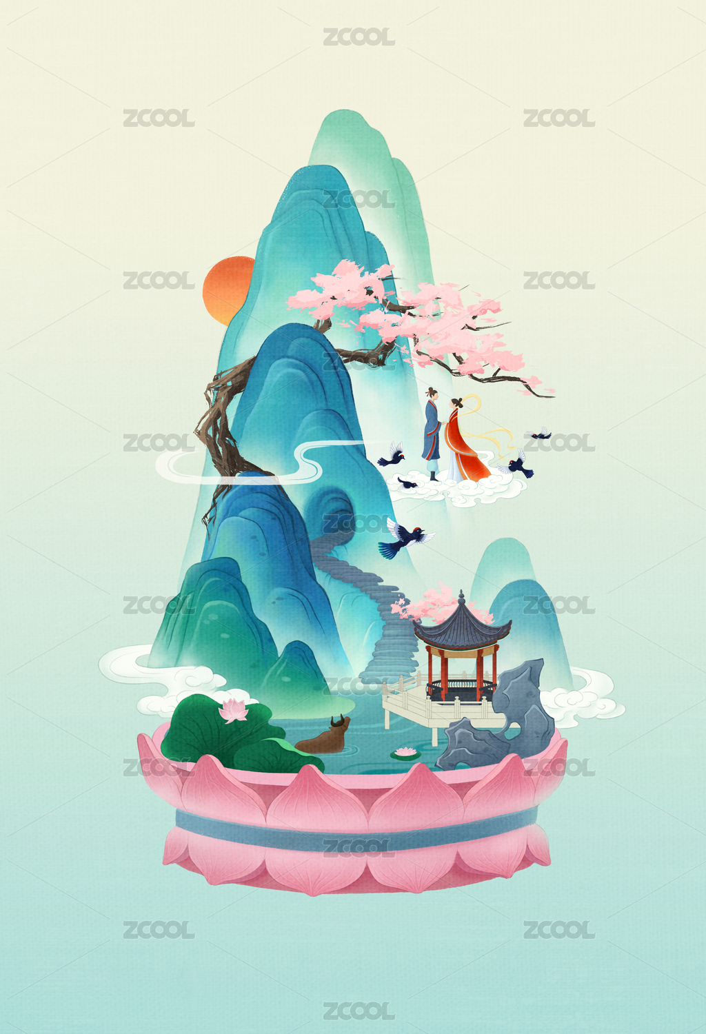 微景观莲花底座山水凉亭牛郎织七夕鹊桥相会