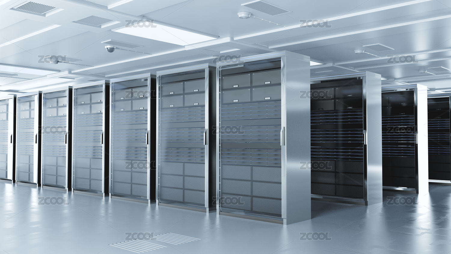 三维渲染的现代化高科技的服务器机房,强大的数据库和运算存储能力。