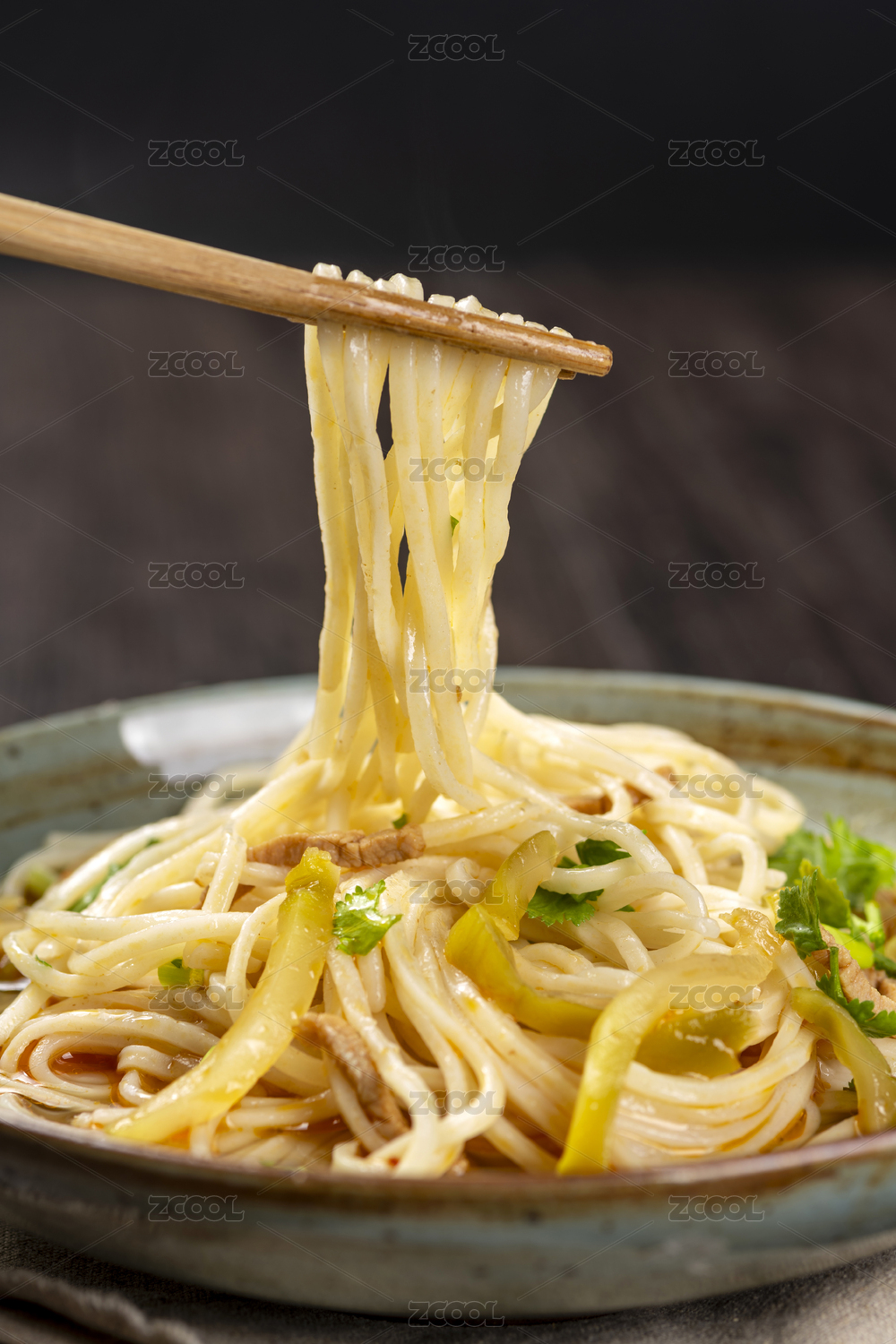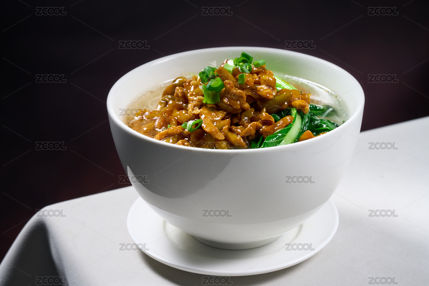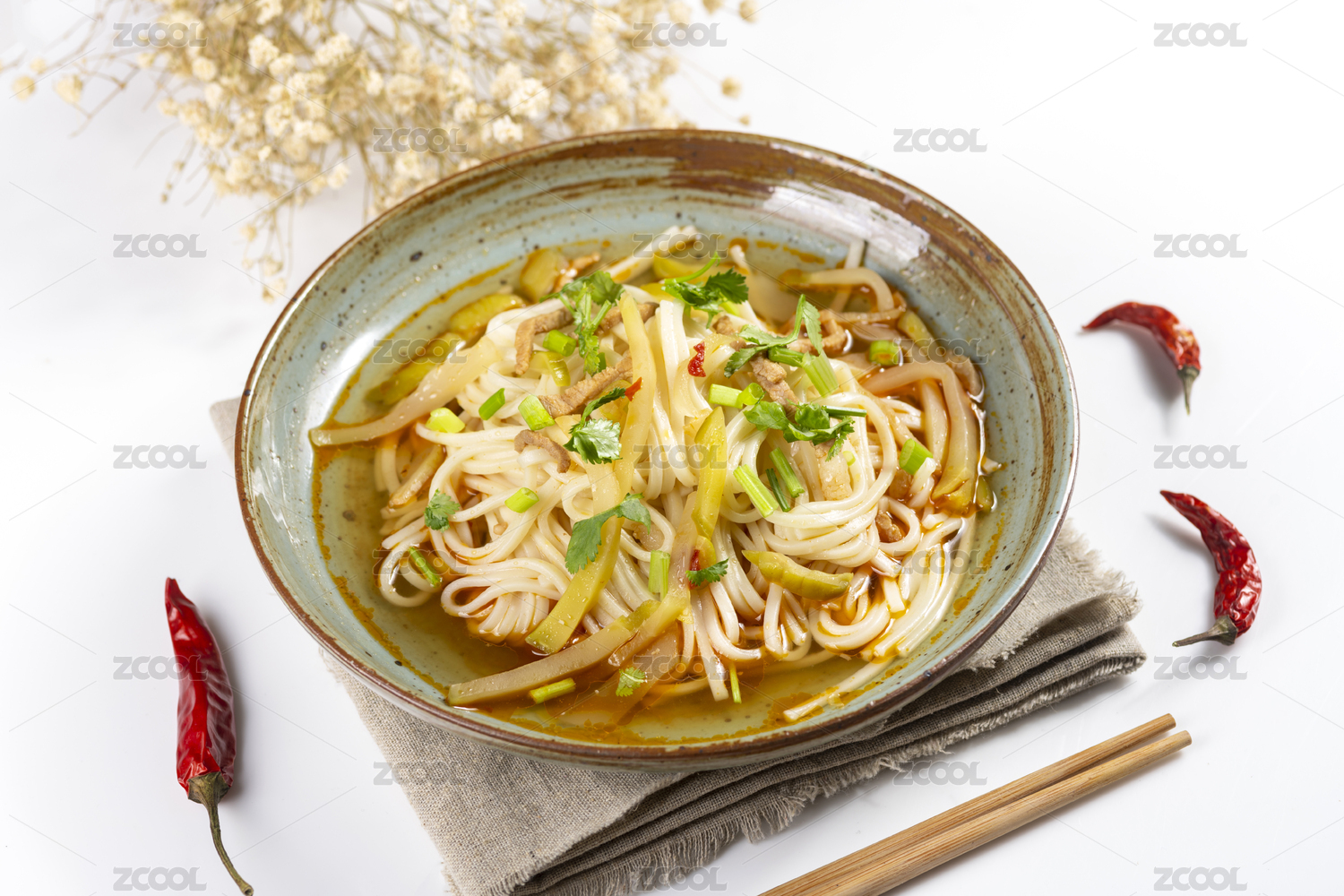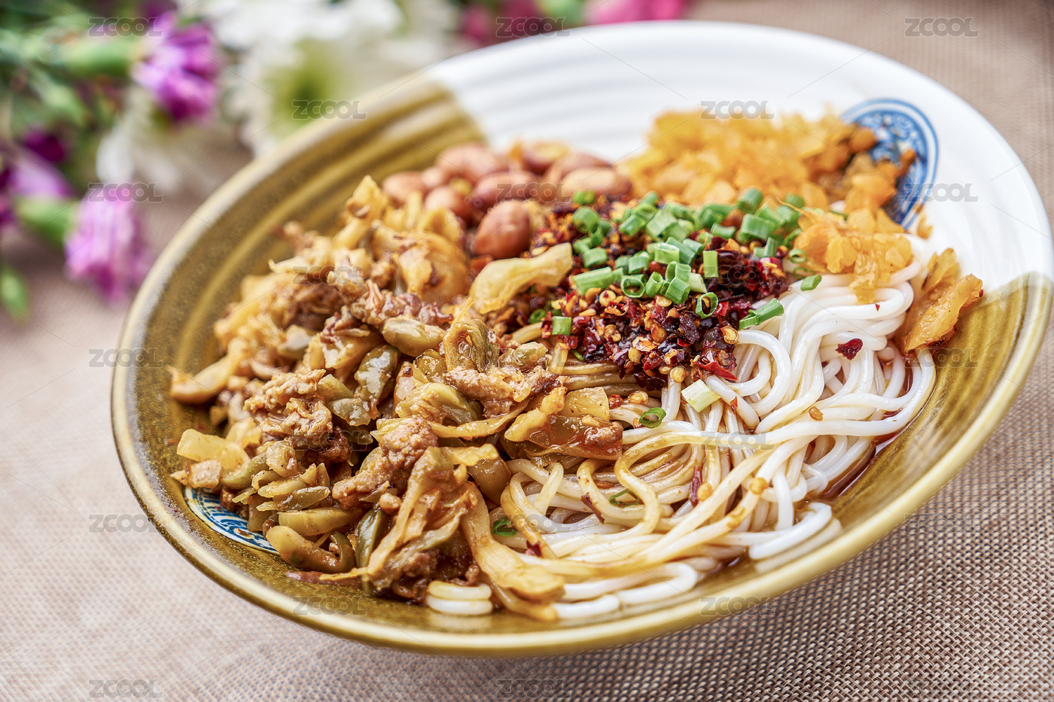 南昌特色小吃榨菜肉丝拌粉盛放在棕色瓷碗中