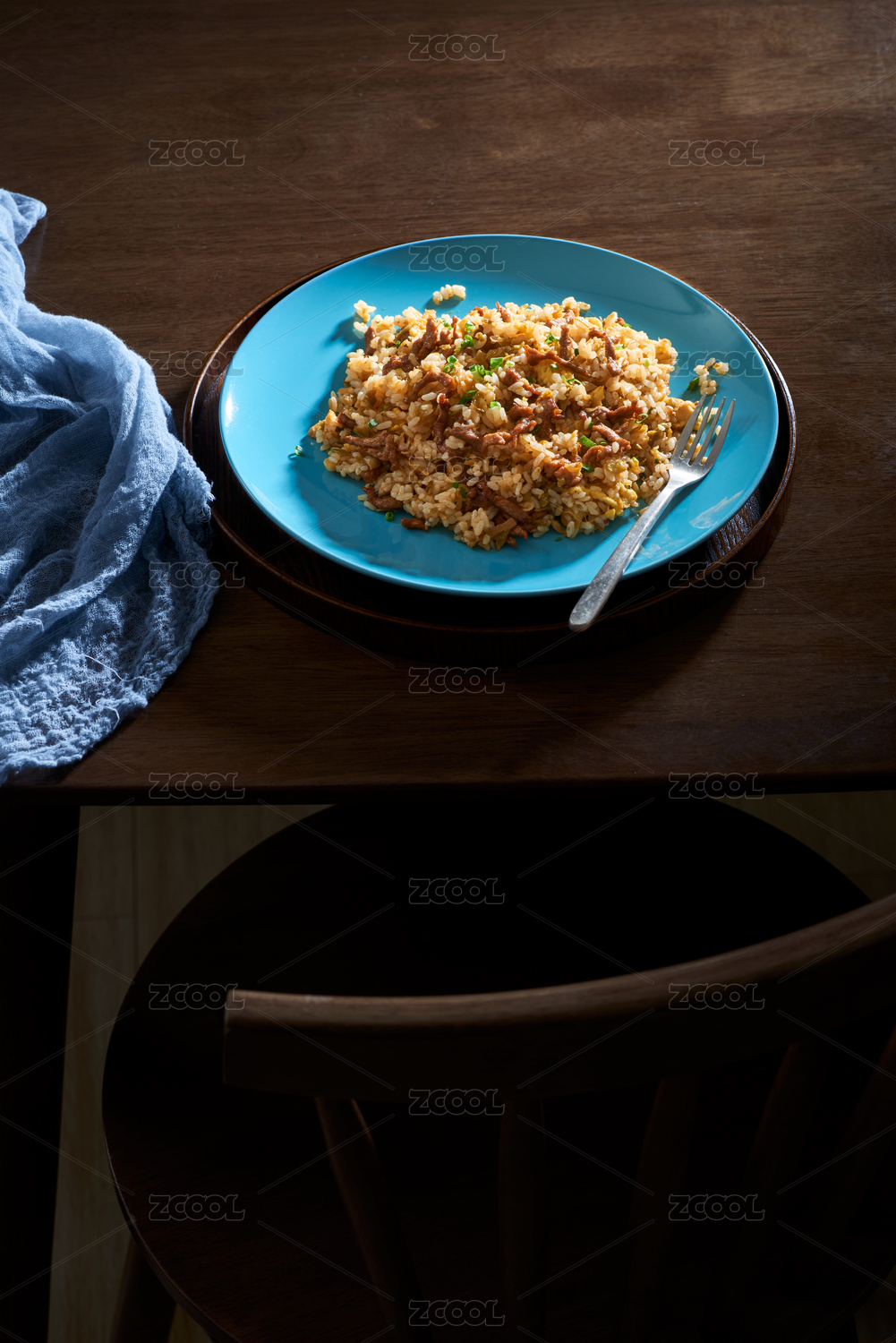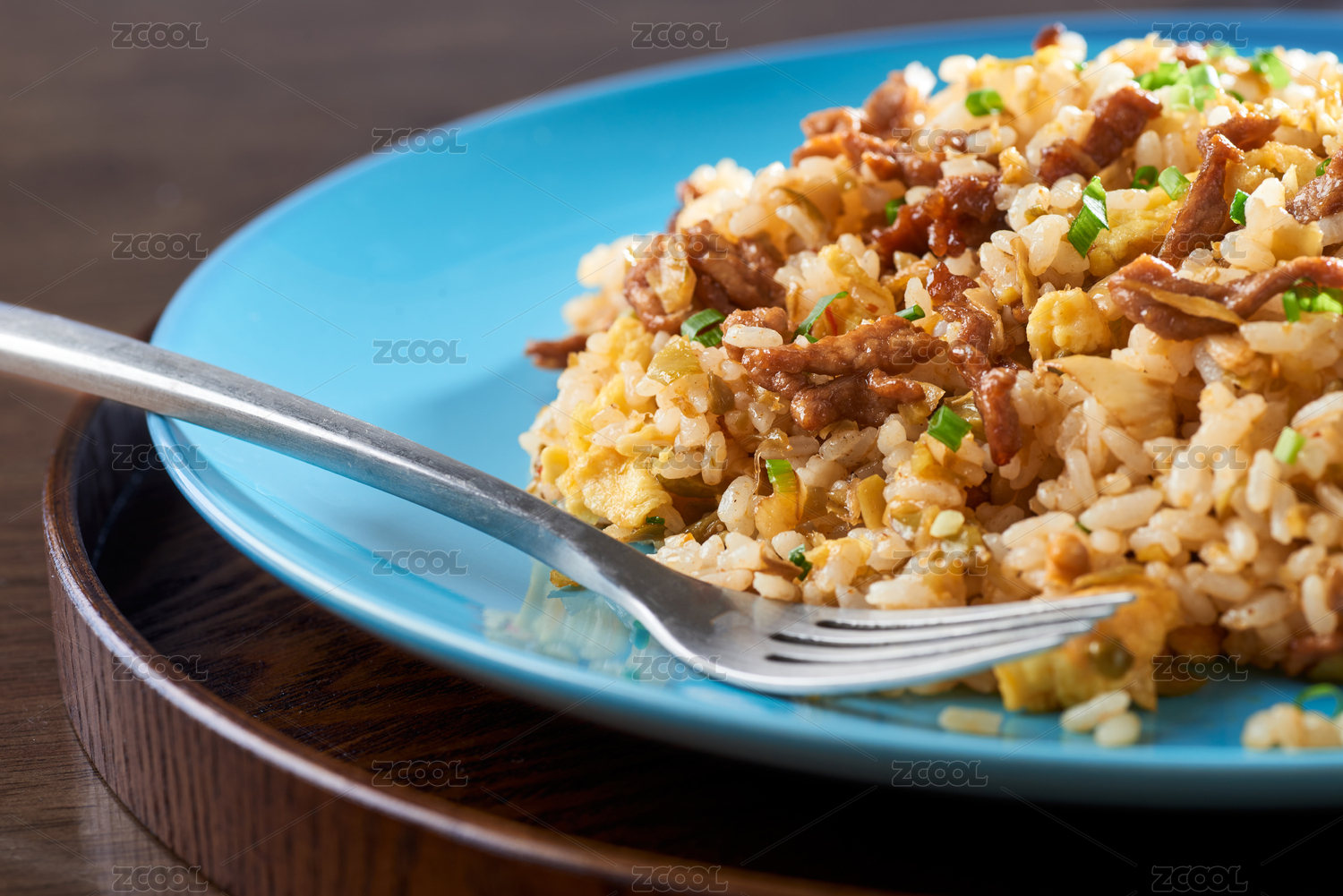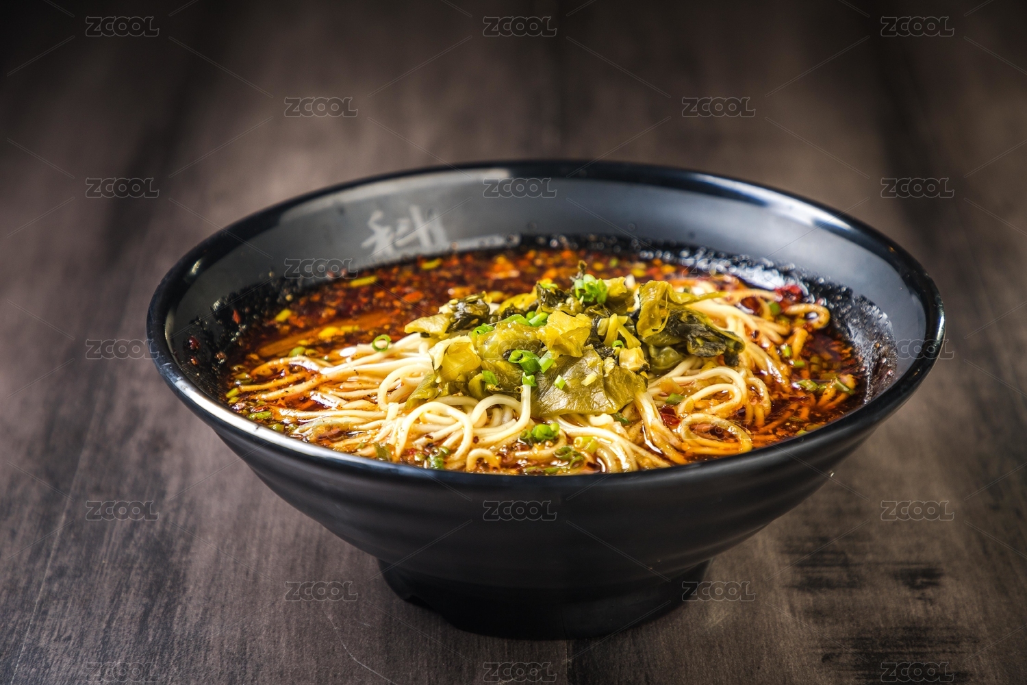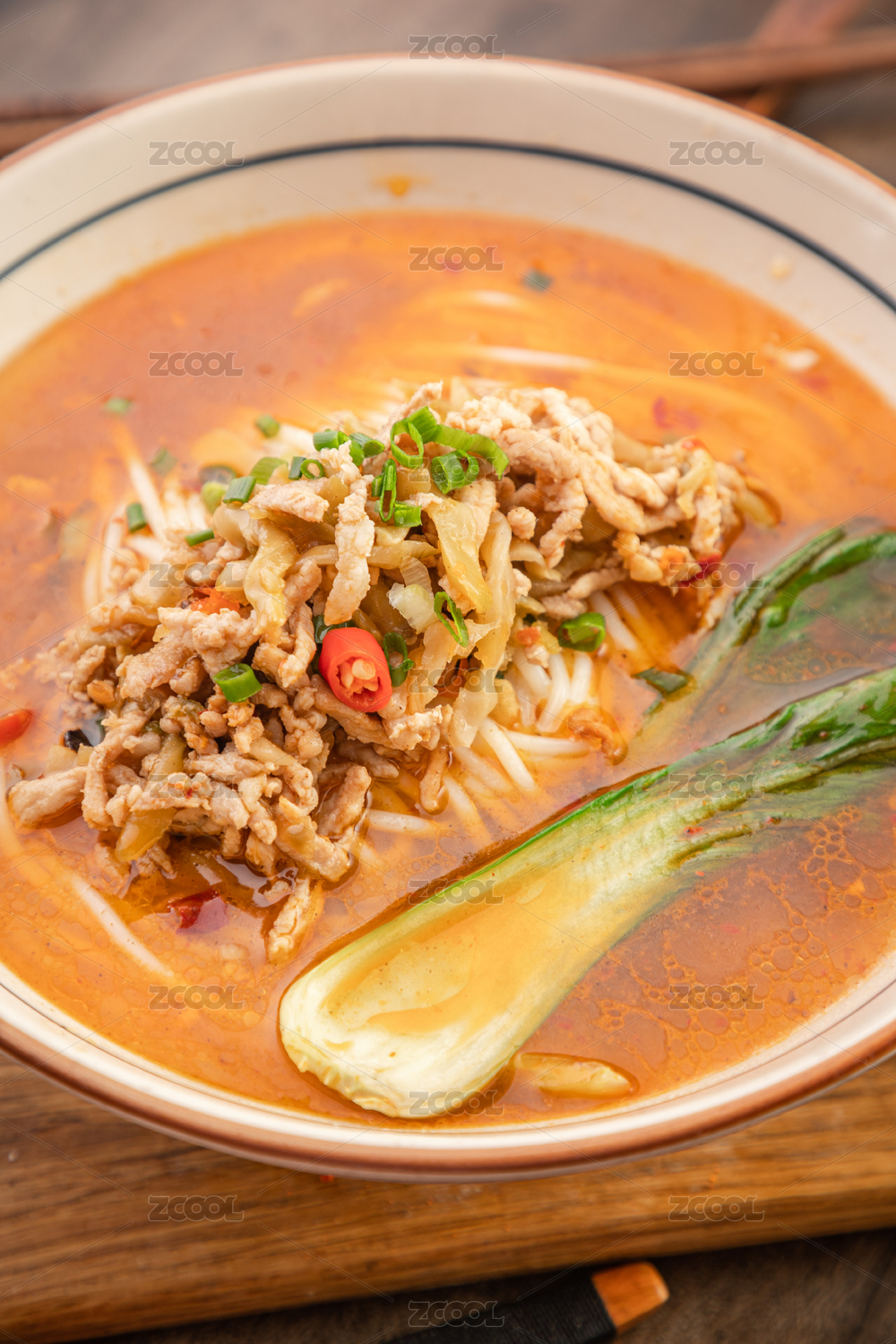 南昌特色小吃榨菜肉丝拌粉盛放在棕色瓷碗中